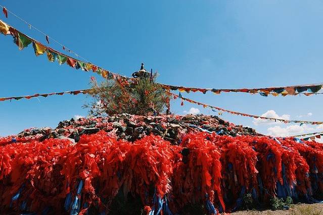 小哲师傅给我们讲道,敖包,原来是在辽阔的草原上人们用石头堆成的道路和境界的标志,后来逐步演变成祭山神、路神和祈祷丰收、家人幸福平安的象征。敖包上系满了大家祈福的红丝带~