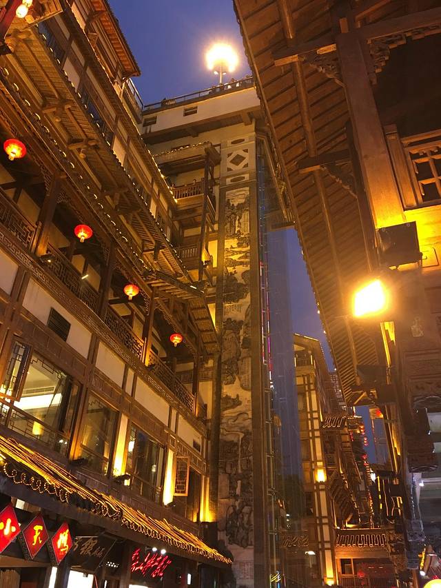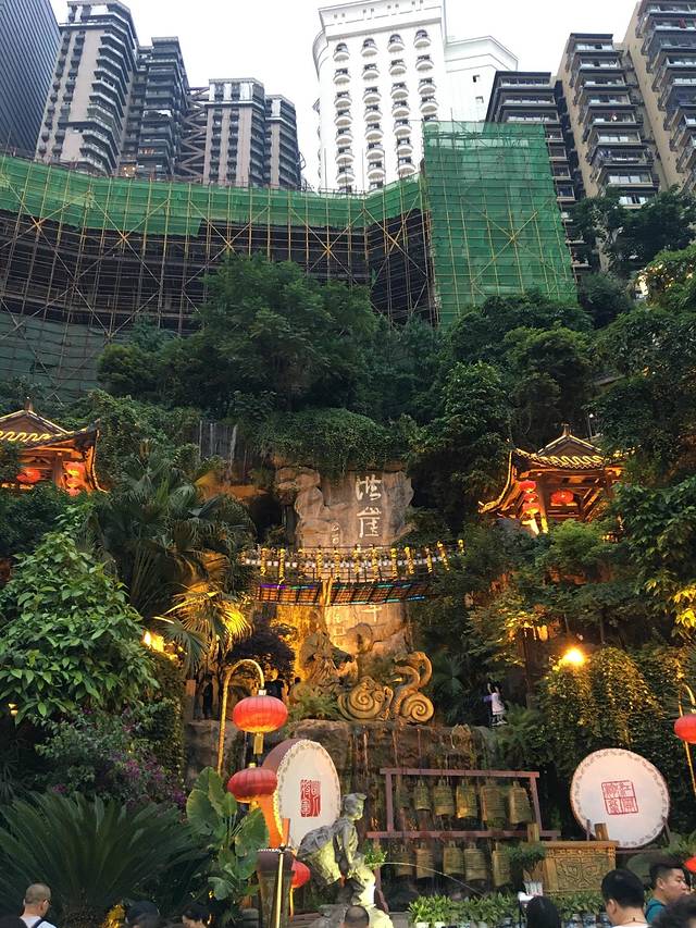 吃过饭就去我心心念念的可以媲美千与千寻的洪崖洞啦,距离解放碑也不远,步行即可到达。我们到的时候大概5点钟左右,天还很亮,后来几天我们才发现在重庆等夜景好难啊,要晚上8点多天才会全黑。我们是从上面下去的,当我得知有这么多层时都惊呆了,外部怎么看也不像有这么高啊,上几层都是各种餐饮,下几层是卖东西的,其中有一层有赌石,第一次见,还蛮好玩的。洪崖洞的原址是吊脚楼,依壁而建,而现在都是后来重建的,其实他之所以这么出名,也就是靠灯光吧。还挺想看看原汁原味的吊脚楼是什么样子的。洪崖洞的上方还在修建,估计以后也是开发成商用吧,重庆的商业繁荣真是让我吃惊,有很多商圈,而每个商圈都很红火,远东百货还有百盛之类的在天津已经开不下去的商场在重庆依然门庭若市。