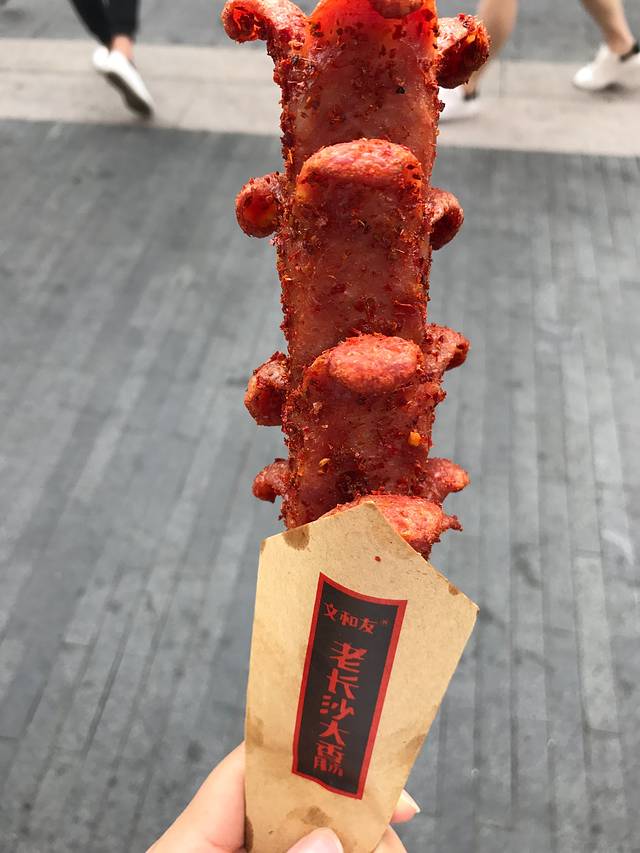 我是个吃货,到了一个地方,首先就是收集美食,还刚好赶上饿了,这个香肠感觉在宁波很流行!很多家都有!我本人能吃辣,沾上很多辣椒,香肠大而香,大大地赞👍🏻