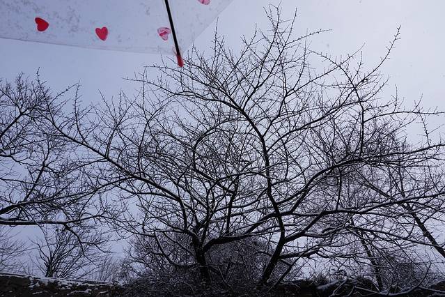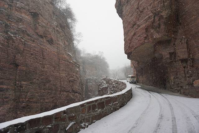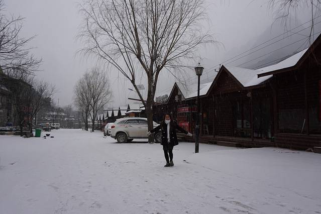 下雪天行驶的车子,好像当时还有些打滑。我们还暗暗担心会被困在山中回不去,明天还得上班的宝宝伤不起……