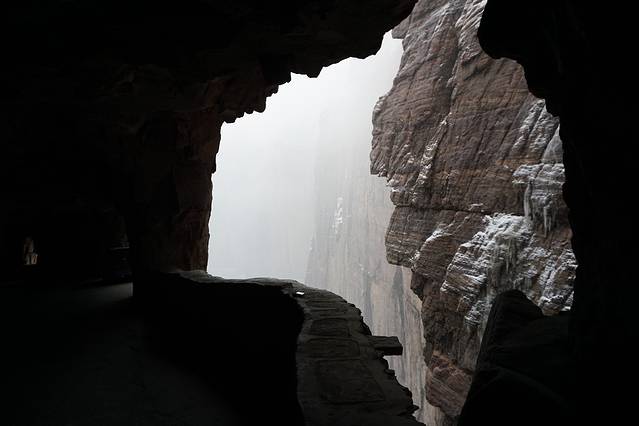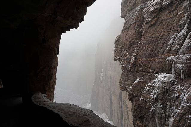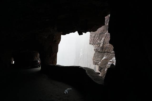 挂壁公路据说是当地13位村民在无电力、无机械的状况下全凭手力,历时五年,硬是在绝壁中一锤一锤凿出来的。这条绝壁长廊,被日本裕田影视公司惊称为“世界第九大奇迹”。