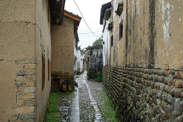 这里的小路和墙体都是用鹅卵石铺就的,形成了村子建筑的第一大特色。几百年来,村民就地取材,从乌溪江里捞来鹅卵石,按照大小形状统一打造,如今石头的表面很多都光滑亮泽。