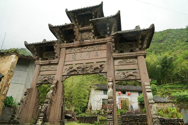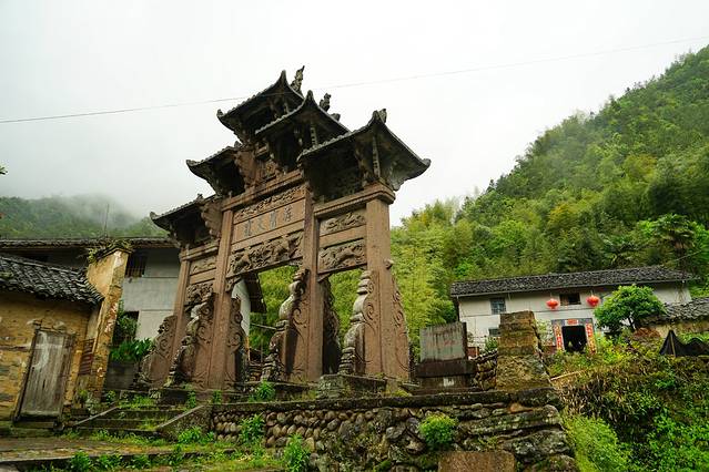 村子里最有名最有代表性的建筑,莫过于"洊膺天宠"石牌坊。据资料显示:石牌坊建于明隆庆三年(1569年),牌坊用花岗石以空雕、浮雕结合艺术构筑,三间、四柱、五楼,翼角起翘,脊顶双角生起,饰吻兽,歇山造。最高楼竖"荣恩"额,次两楼置云图额。明、次间上、中、下叠三枋。明间上坊作双龙抢珠浮雕,次间大额枋为主题额枋,遂昌知县池浴德题"洊膺天宠"楷书四大字。小额枋署"封工部营缮同、员外郎事主事叶弘渊,由子以藩贵立。"即因叶以蕃生前贵为朝庭郎官,其父依然享有子贵之诰封,建坊以示再次受天子宠任之意。下枋为剔空石雕双狮抢球图、瑞兽、卷云等。四柱下部均有抱鼓石前拥后扶,剔空雕刻,技艺精湛。
