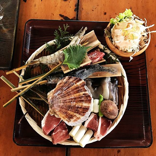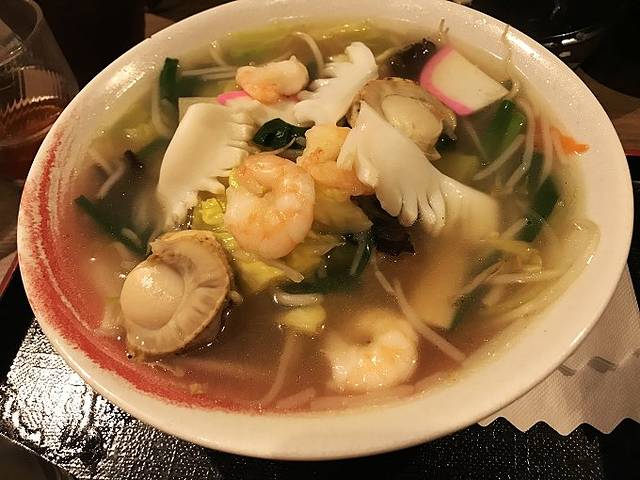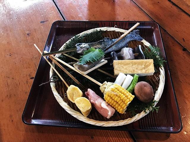 我们点了三个套餐,就是不同的串烧拼,鱼、虾、牛肉、猪肉、巨型扇贝、时蔬等等,还点了一锅特色面,是用南瓜熬制的,跟咱们这边大宽的宽度一样。老板过一会进来了,拿了一个竹蜻蜓,主要说的日语,时不时来几句英文,还能蹦点儿中文,哈哈,跟Samon玩了好久,还问他知不知道多啦A梦,我心想,那是我小时候的偶像啊,Samon还真不知道,他也学着老板两手搓着竹蜻蜓飞着玩,只不过每次都飞到炭火里,我们赶紧给捞出来。