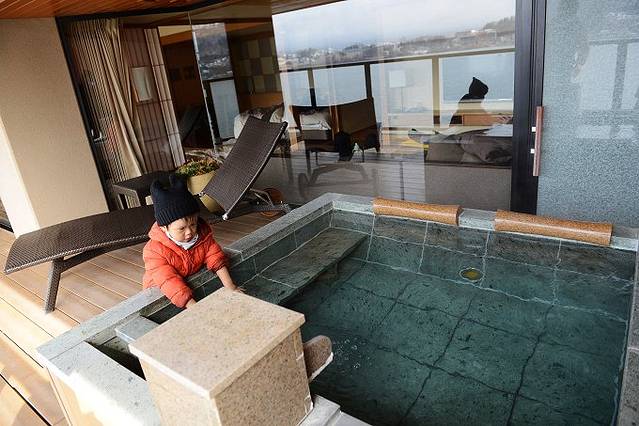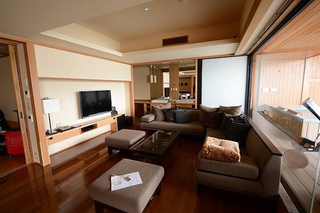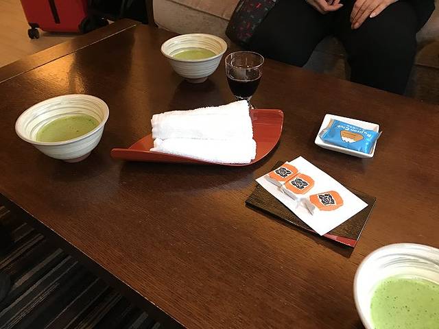 大厅办理入住等候,服务员都是跪式服务,端了抹茶,柿子做的和菓子,给Samon上的是巧克力和葡萄汁。10分钟后我们拿到了钥匙,在此之前我没有告诉妈妈和S我定的这个酒店是什么配置,但愿可以让他们满意,心中暗暗想到。