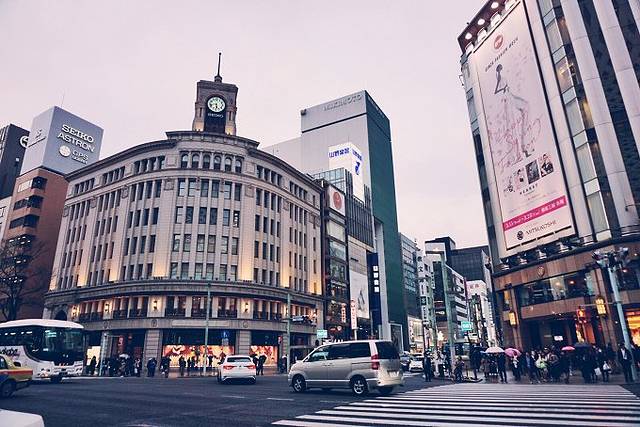 銀座鼎鼎大名最繁华的路口,中央通与晴海通的交界,銀座四丁目。左边带大钟表的建筑就是和光百货,建于1932年,前身是服部钟表店的零售部,右边的就是銀座三越。