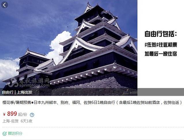 自己定机票如果不是抢到0元机票的话还是没有自由行套餐来的划算,所以简单考虑一下就定了【春秋旅游】的自由行套餐,当时还是4天的行程,让我有些意犹未尽,现在是6天往返的行程,非常不错。899元就往返日本一趟了呀,还包一晚住宿,【住宿安排的非常贴心,因为最后一晚,所以在离机场的很近的佐贺JR站,这个站附近有几个大型超市,1家开到晚上12点,一家是24小时营业,让回城购物的朋友不必要担心了,大可以买买买再杀回去。】唯一很可惜我去的时候樱花还有一个礼拜才开,哈哈,真的是诚意推荐,樱花季避开大阪京都东京等热门赏樱地的话,到九州很不错,这是一个还没被过度开发的地方,原汁原味,只看风景,不用看人挤人。