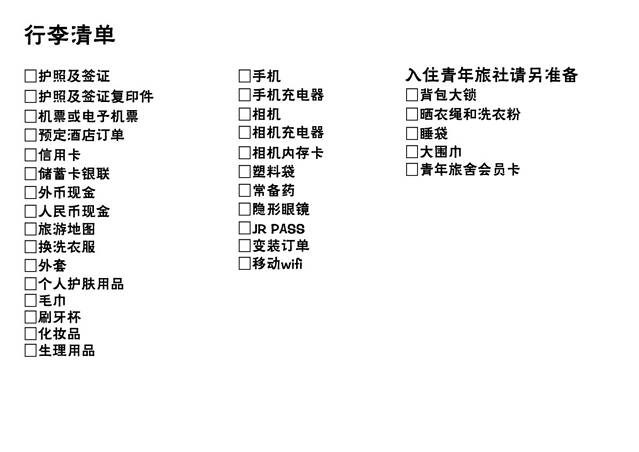 其次为大家献上一张亲自整理的行前行李清单,上篇游记里也用到,大家需要的话可以保存打印出来,方便做记录勾选已经准备好的物件。