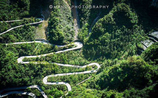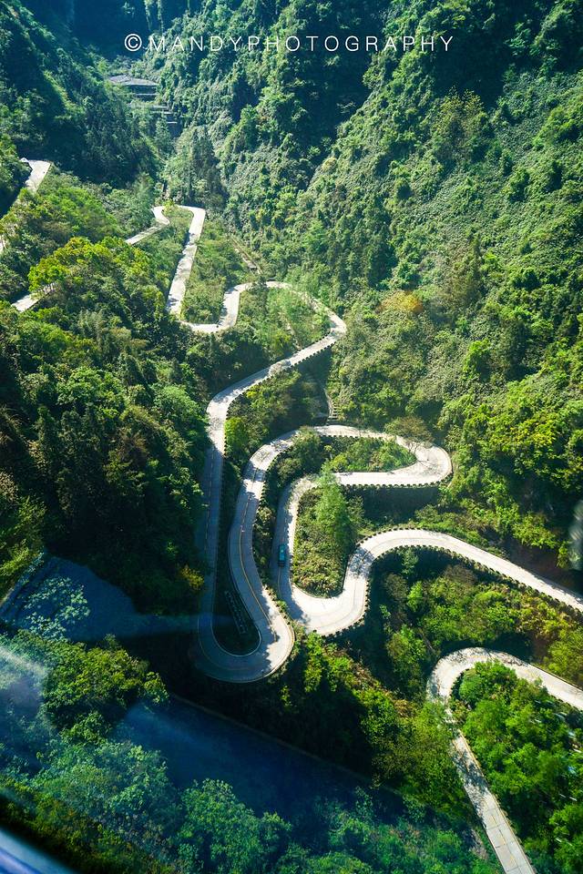 在缆车上能看到整个山峰美丽的风景,这个99道弯的山路也是天门山非常出名的一个景点,从前只能远观它而无法体验,现在开通了环保车,我们可以直接坐车绕着山路下山。记得提前服一片晕车药,扶稳了。