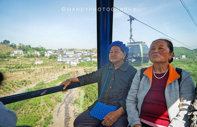 一开始以为这些当地阿姨都坐习惯了,处变不惊,全程没有一个夸张的表情,眼睛静静地看向山外。但当我们在陡坡上升处仍然站立起来用相机望窗外拍照的时候,阿姨也开始不淡定地让我们赶紧坐下别拍了,缆车晃。