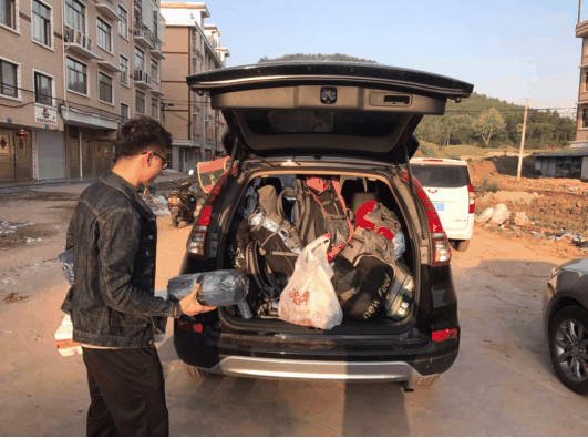 大家开始大包小包的搬运行李,原本宽敞的车舱,马上被塞得满满当当!