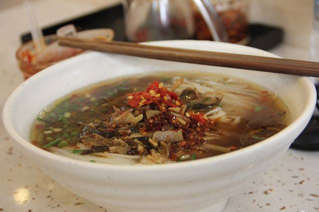 从岳麓山出来附近有很多吃的,但是大型的饭店不多,小吃又没位置坐,当时我只想快点躲到有空调可以坐的地方,吃什么无所谓。后来选择了一家还是很有名的面馆杨裕兴面馆,价格我记得因为实惠至今还有点印象,我点的好像只要8块一碗,景区附近真是难得的价位,味道当然不错。