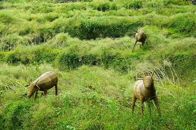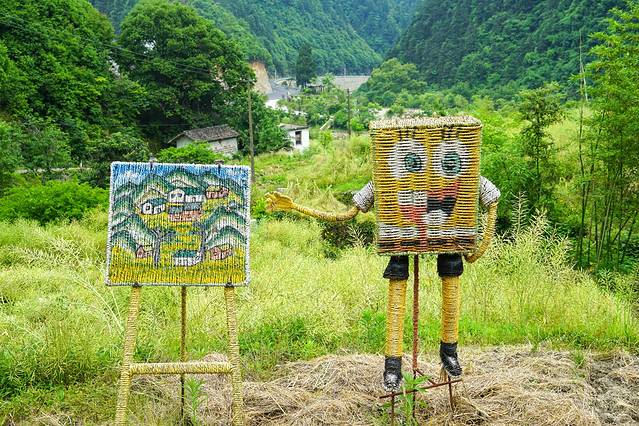 沿着左边的小路进村,周一的中午基本整个村子里基本没有游客,旁边的农家里传出了炒菜的声音和美味,我咽了下口水继续前行。旁边的农田里,早已没有了油菜花的痕迹,只有一垄一垄的油菜籽等待收割,但是田里这些卡通造型还是很显眼,只能打开脑洞的想想,再漫山遍野的油菜花之中,它们曾经也是这个田园的恩宠吧。