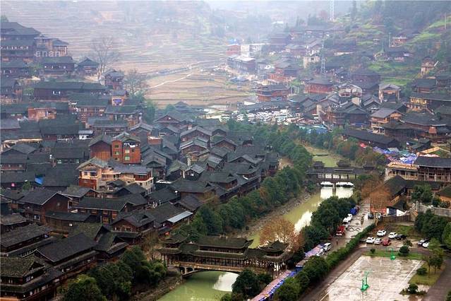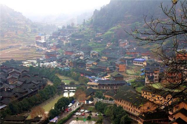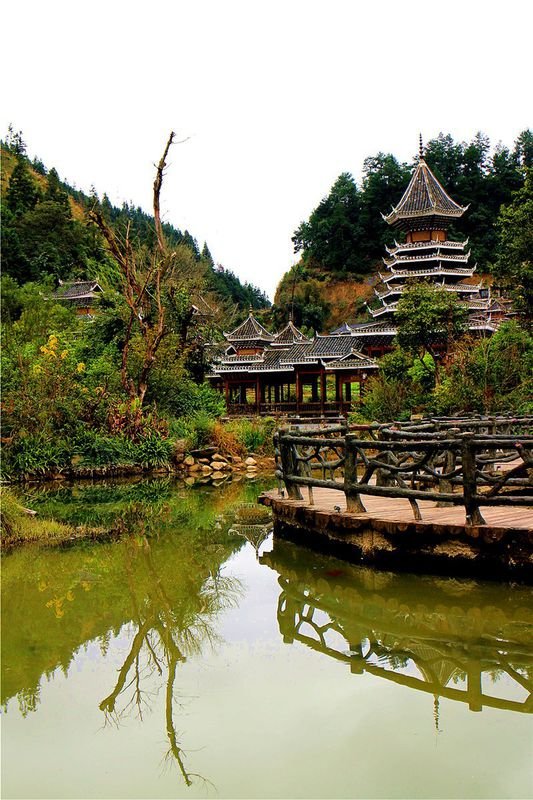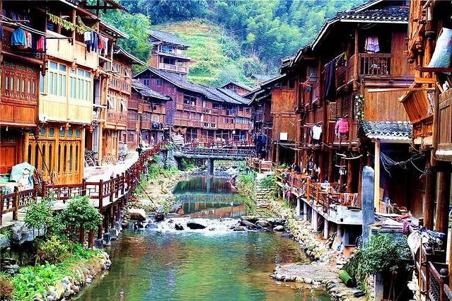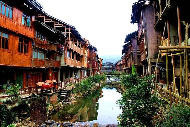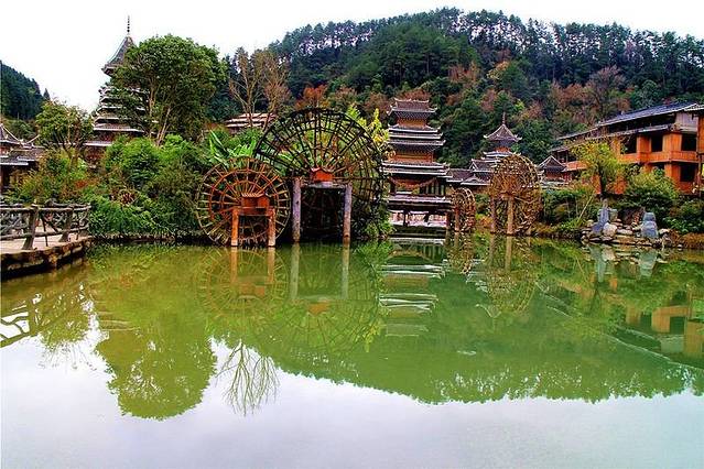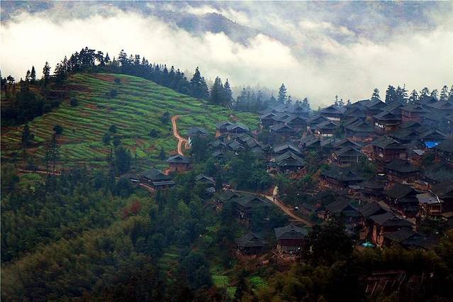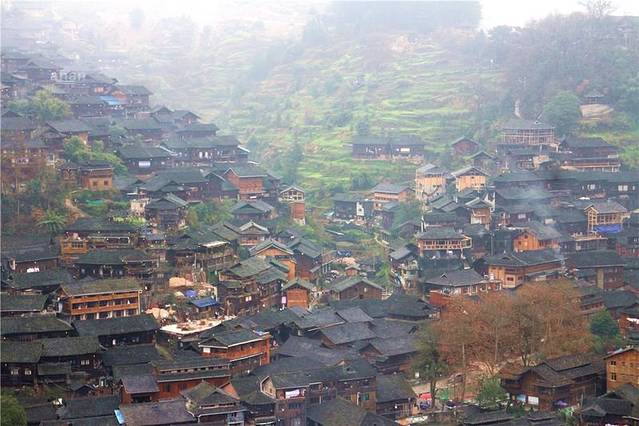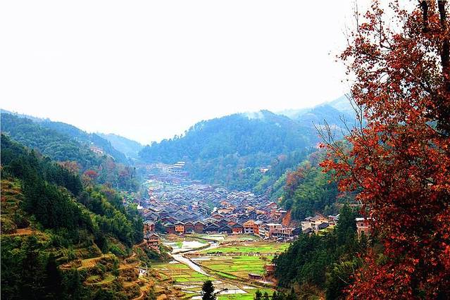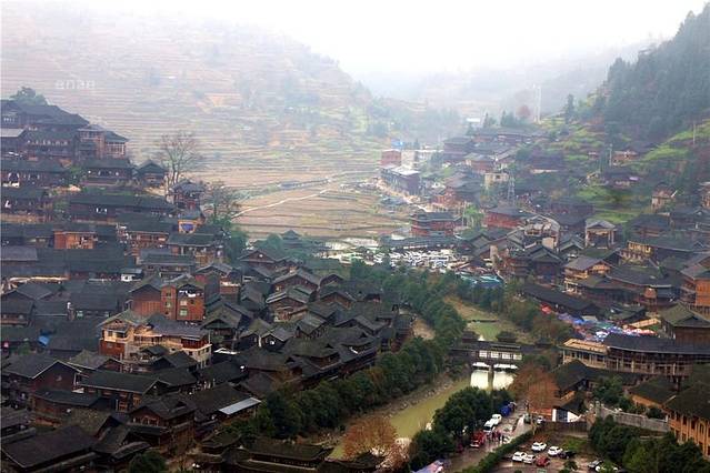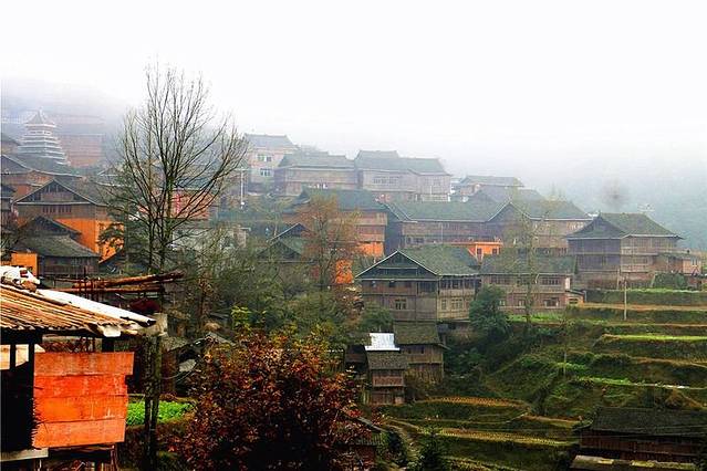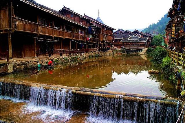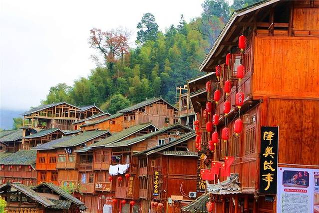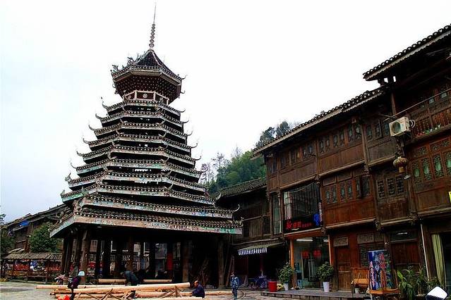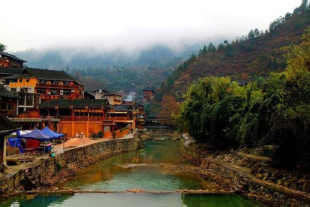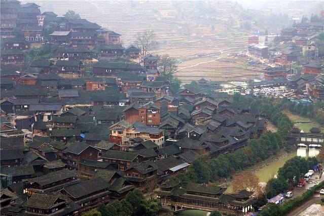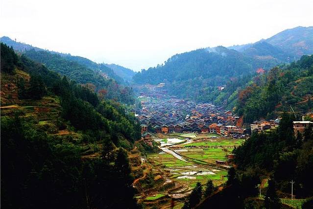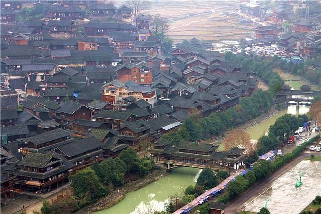 肇兴侗寨:肇兴侗寨是全国最大的侗族村寨之一,有居民6000多人,被称为"侗乡第一寨"。寨中房屋全部为干栏式吊脚楼,均沿河而建,错落有致。寨内全部为陆姓侗族,建有鼓楼五座,花桥五座,戏台五座,以鼓楼分为自然片区,当地称之为"团",名称为:仁团、义团、礼团、智团、信团,各旅店地址也以团的名字为主要坐标。侗寨鼓楼是侗寨的标志,人们多在此集会、社交、休闲,五座鼓楼的外观、高低、大小都风格各异,蔚为大观。肇兴只有一条主街,没有汽车站,班车汇集的附近就是肇兴菜市场,两边街铺林立,沿着街往前走能看到一条河,五团便沿河分散。