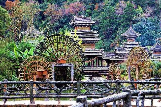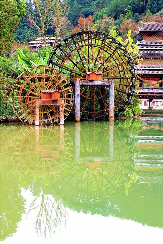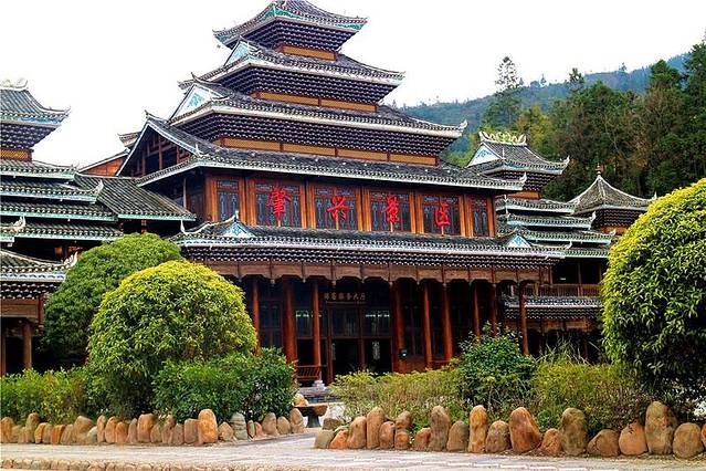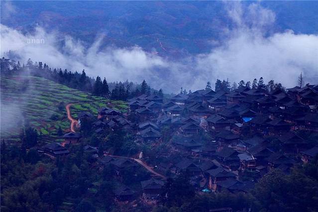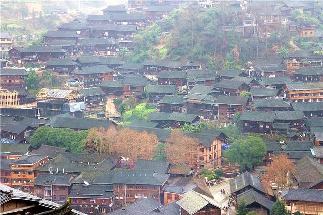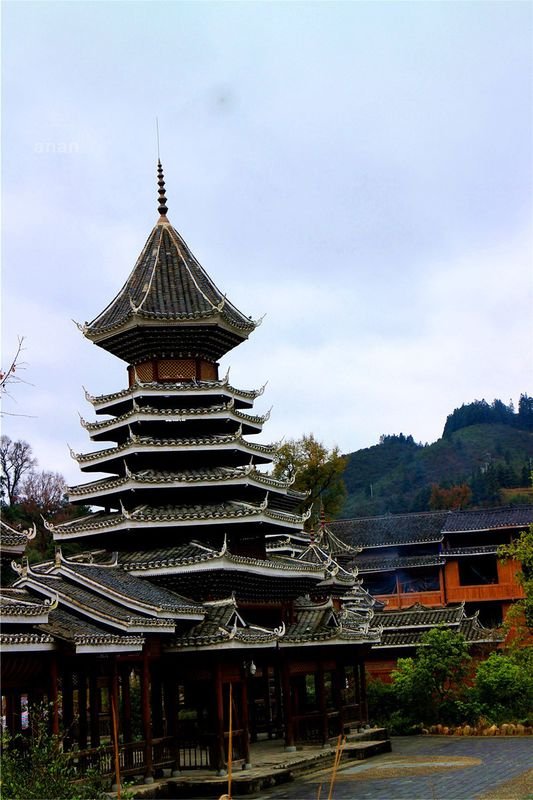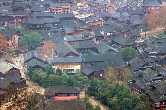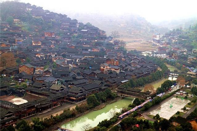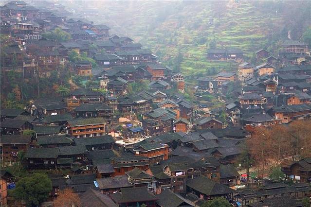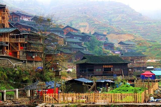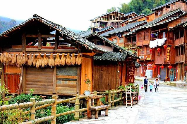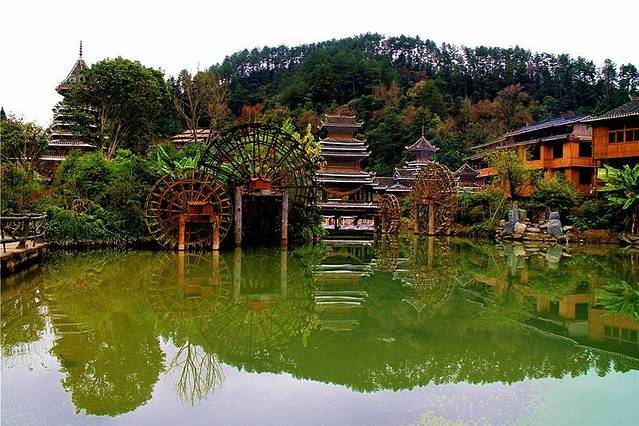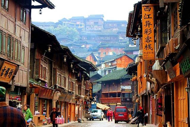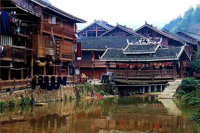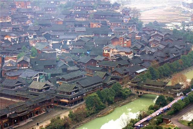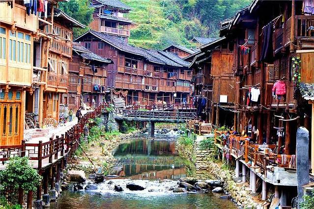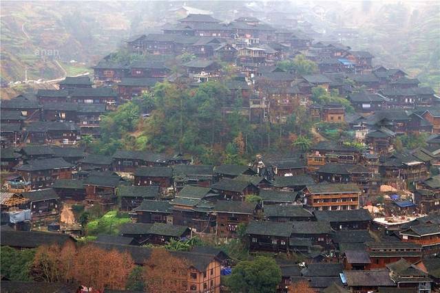 肇兴侗寨:肇兴侗寨是全国最大的侗族村寨之一,有居民6000多人,被称为"侗乡第一寨"。寨中房屋全部为干栏式吊脚楼,均沿河而建,错落有致。寨内全部为陆姓侗族,建有鼓楼五座,花桥五座,戏台五座,以鼓楼分为自然片区,当地称之为"团",名称为:仁团、义团、礼团、智团、信团,各旅店地址也以团的名字为主要坐标。侗寨鼓楼是侗寨的标志,人们多在此集会、社交、休闲,五座鼓楼的外观、高低、大小都风格各异,蔚为大观。肇兴只有一条主街,没有汽车站,班车汇集的附近就是肇兴菜市场,两边街铺林立,沿着街往前走能看到一条河,五团便沿河分散。