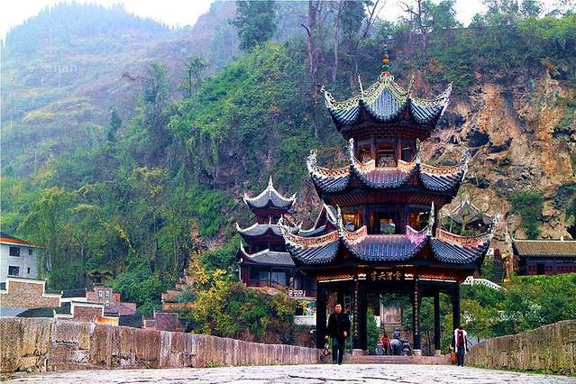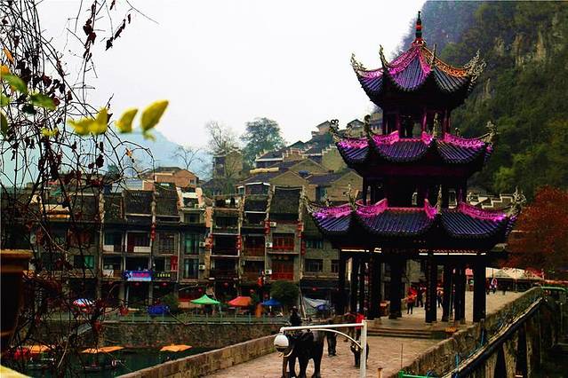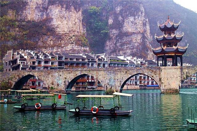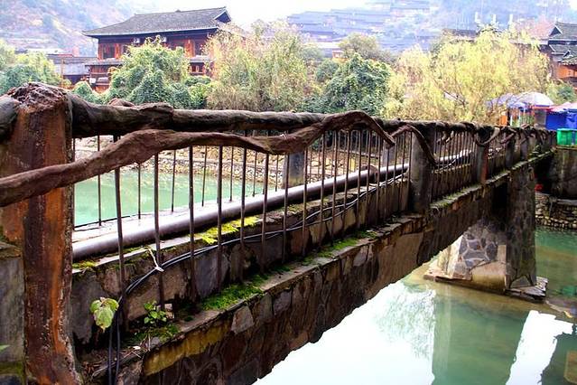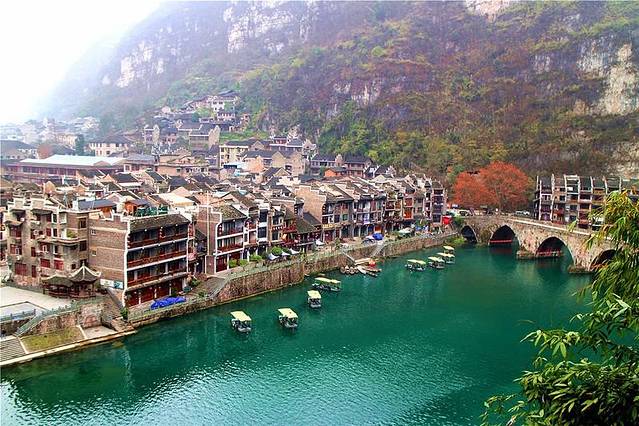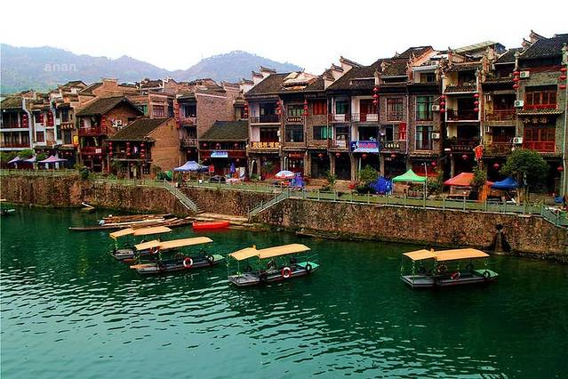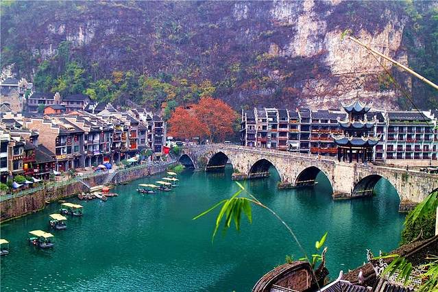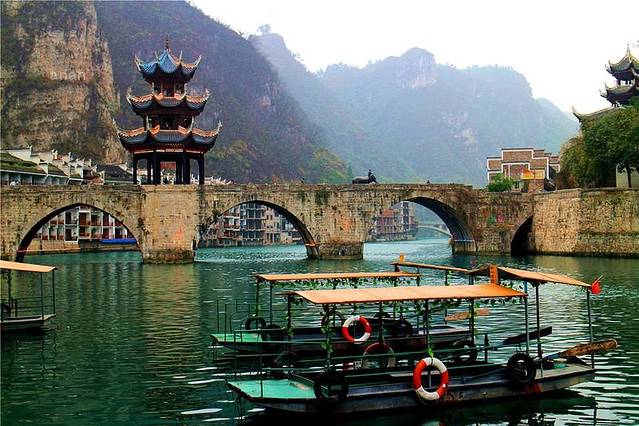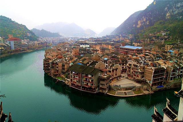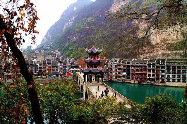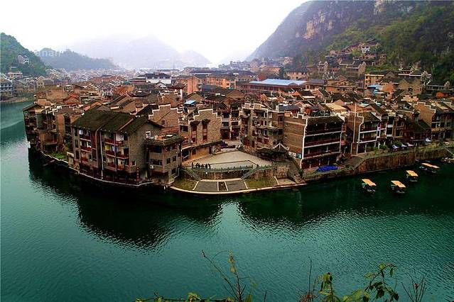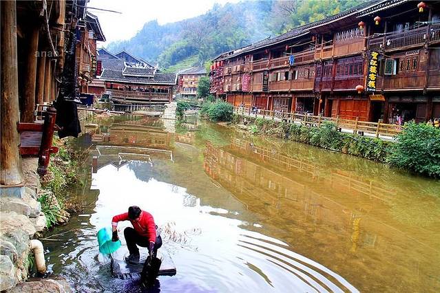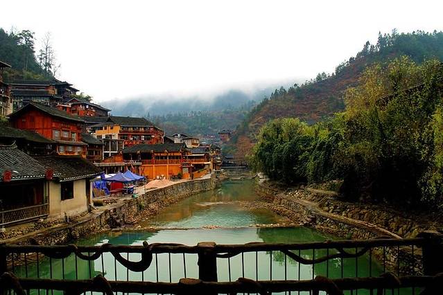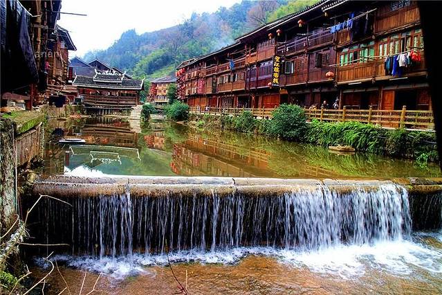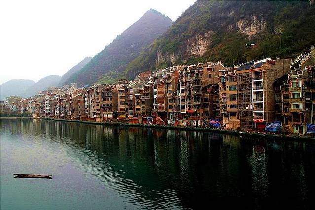 镇远古镇:镇远自汉高祖五年(公元前202年)设县开始,已有2200多年的历史,是云贵高原上历史最悠久的名城。由于镇远地处湘黔驿道与沅江水路的交汇处,自古以来便是水陆交通的要冲,由湖广经贵州到达云南乃至缅甸、老挝、泰国、印度等国的古驿道就通过这里。镇远的母亲河——舞阳河蜿蜒穿城而过,一汪碧水绿得叫人陶醉。相比阳朔、丽江、凤凰名气极大的古城来说,镇远古城要安静多了,做生意的多为本地人,这里的夜生活也不很丰富,在天黑没多久后,街上就逐渐恢复了宁静,游客也多会选择在阳台上静静地欣赏夜景。