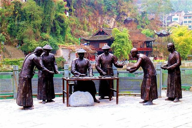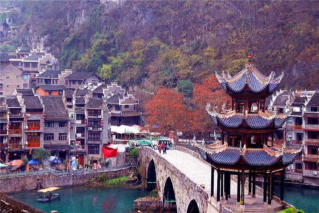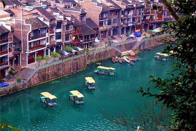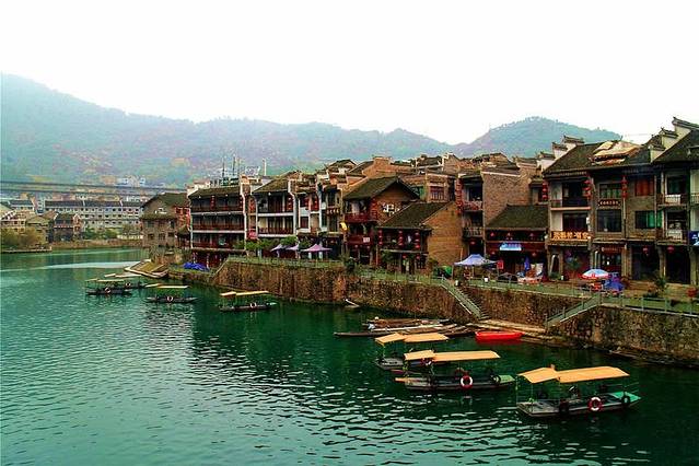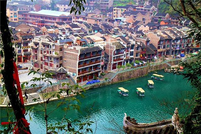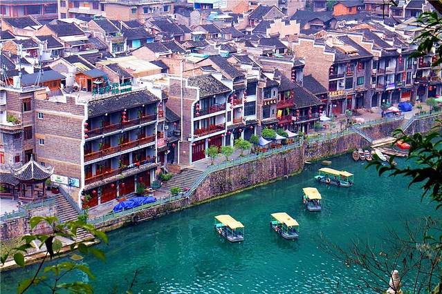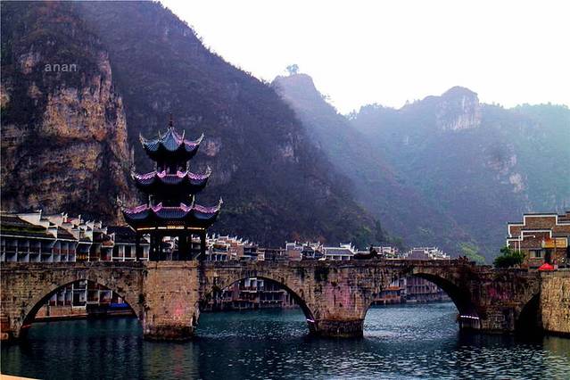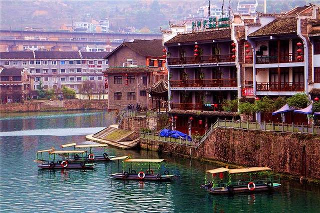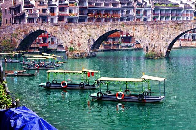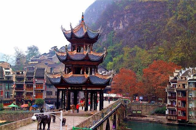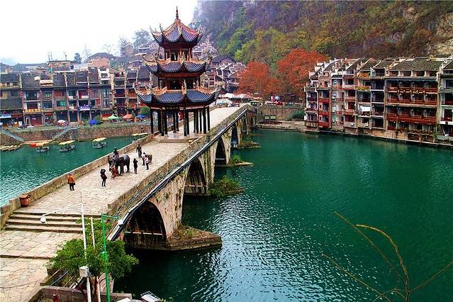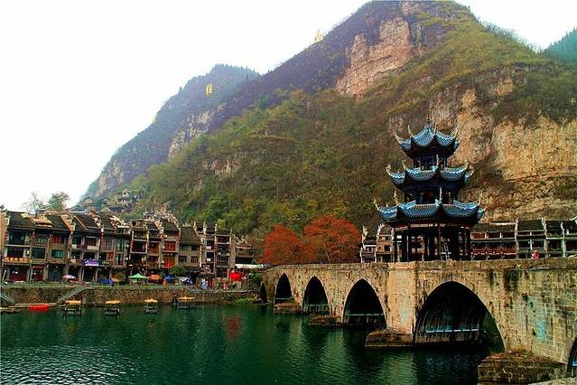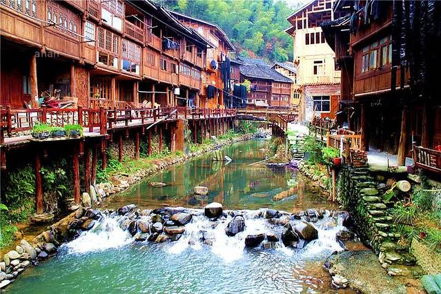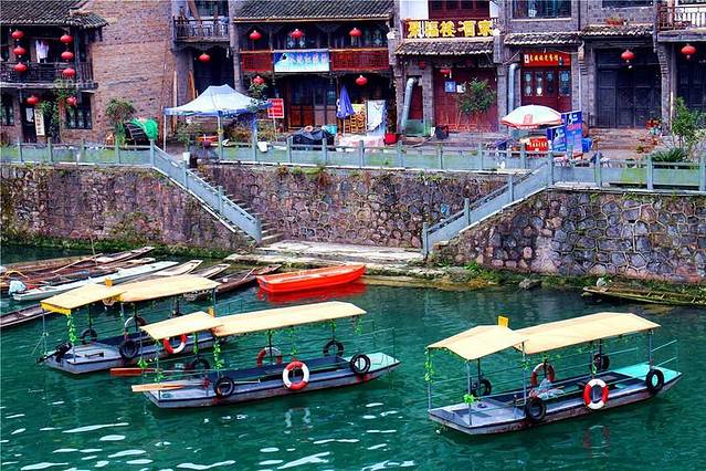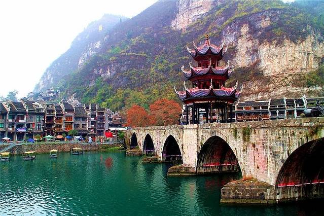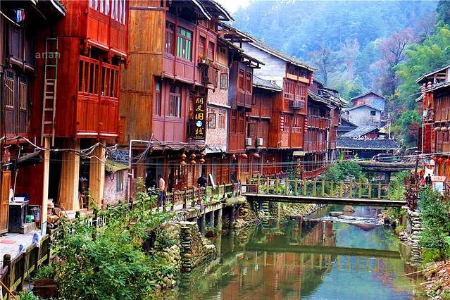 镇远古镇:镇远自汉高祖五年(公元前202年)设县开始,已有2200多年的历史,是云贵高原上历史最悠久的名城。由于镇远地处湘黔驿道与沅江水路的交汇处,自古以来便是水陆交通的要冲,由湖广经贵州到达云南乃至缅甸、老挝、泰国、印度等国的古驿道就通过这里。镇远的母亲河——舞阳河蜿蜒穿城而过,一汪碧水绿得叫人陶醉。相比阳朔、丽江、凤凰名气极大的古城来说,镇远古城要安静多了,做生意的多为本地人,这里的夜生活也不很丰富,在天黑没多久后,街上就逐渐恢复了宁静,游客也多会选择在阳台上静静地欣赏夜景。