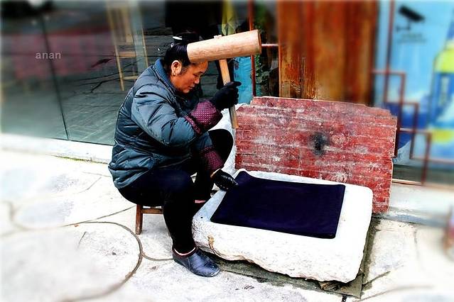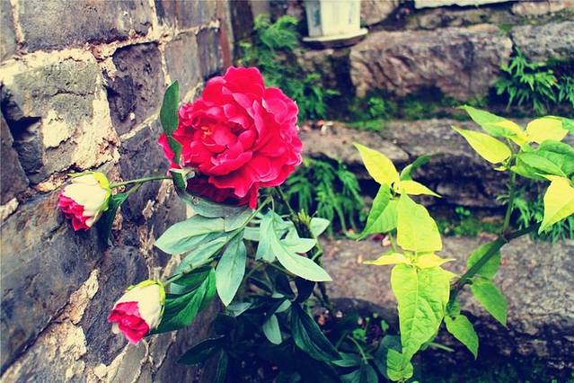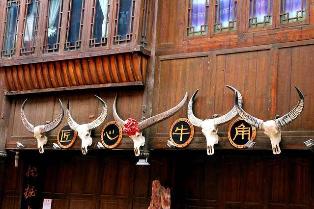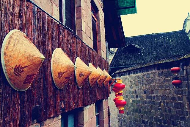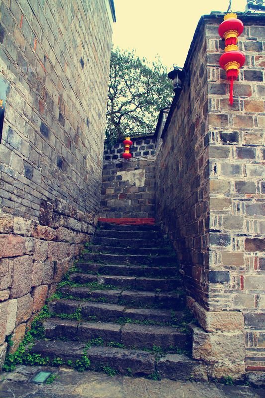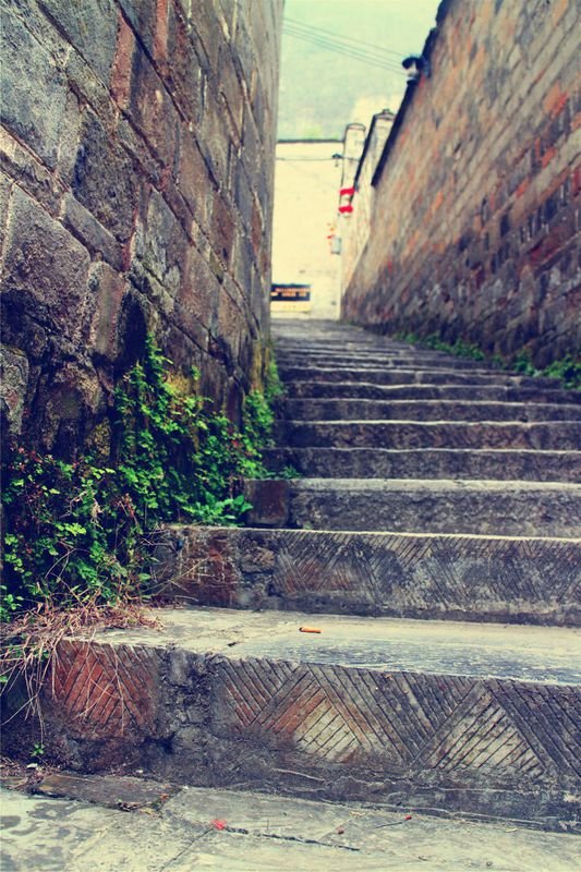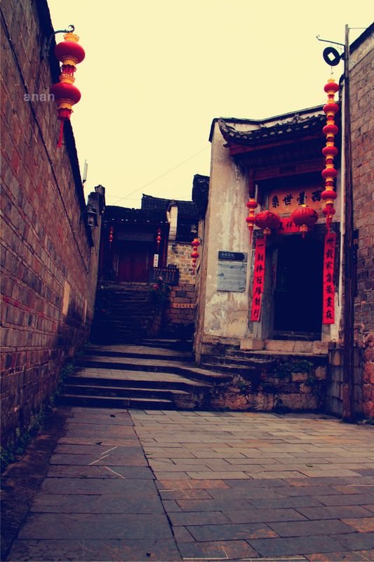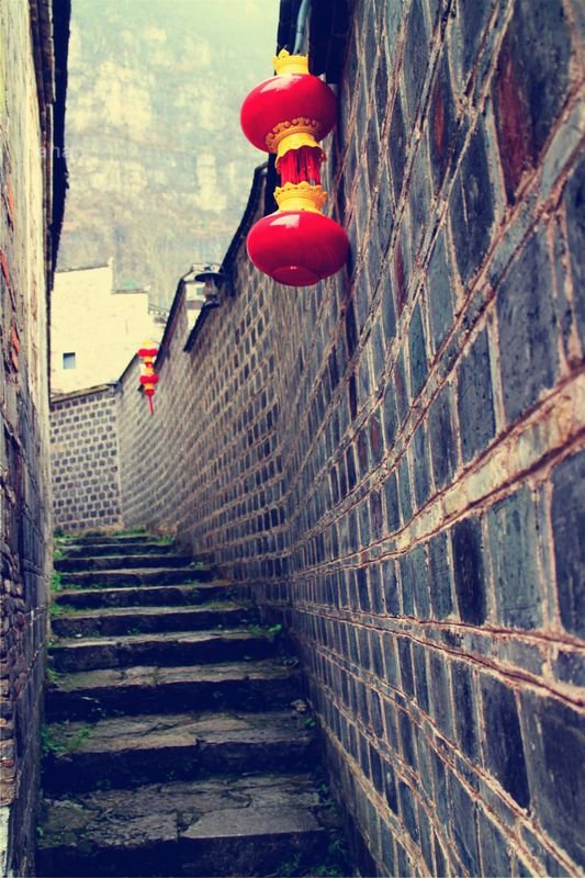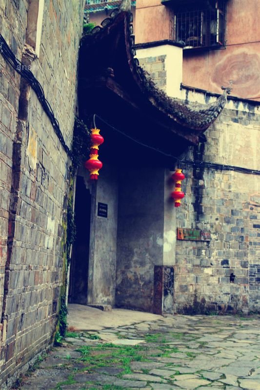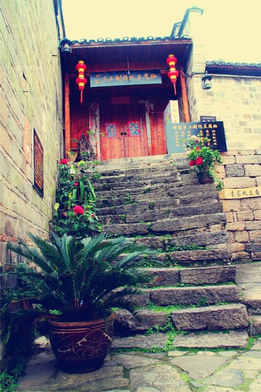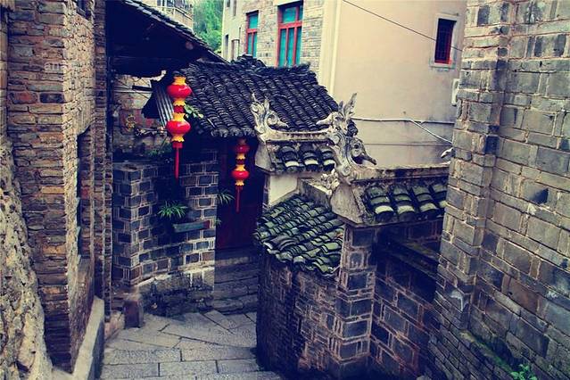 主街道的右边就是四方井巷,也就是传说中的歪门邪道,拾级而上,信步闲游,小道曲曲折折,镇远古镇巷道依山就势地随着地形的变幻蜿蜒盘旋,像极了古树的根须,密密匝匝的四散分开。巷道两旁的门都一个模式,在大块大块青条石做门框的映衬下,显得厚重而有些狭窄。各家的门前,总还有那么几道台阶,或高或低。在巷道镜头或是中途,总是有一株门楣映入眼帘,镇远民居的大门都不是开在院房的正中央,给人一种歪歪扭扭的感觉。但是正是这种不规则,也就现实了这里不同于别处的独特风格--“歪门邪道”。