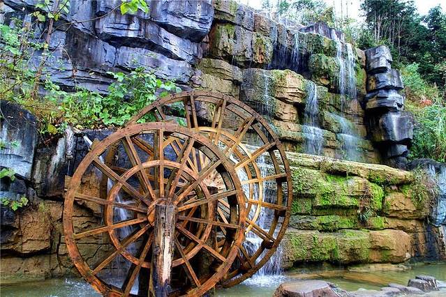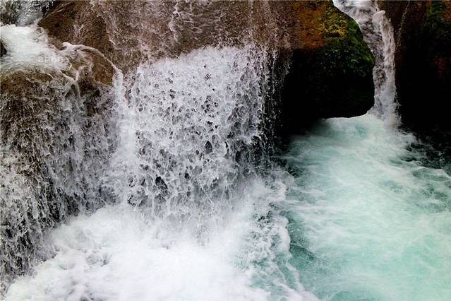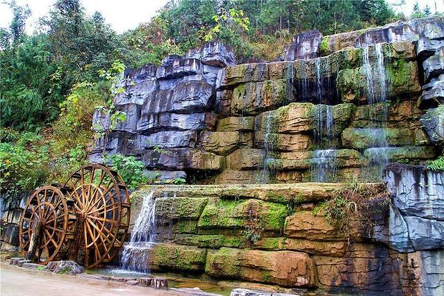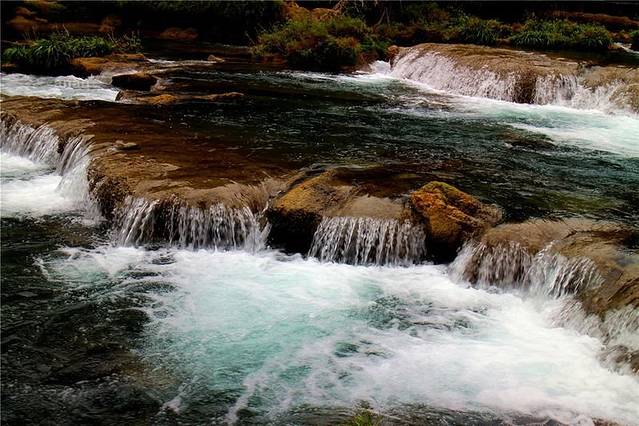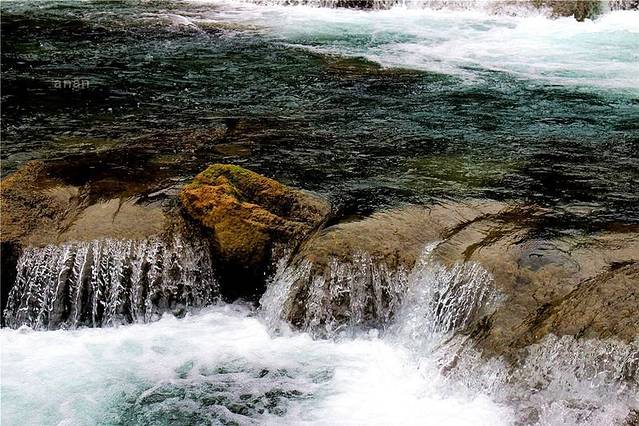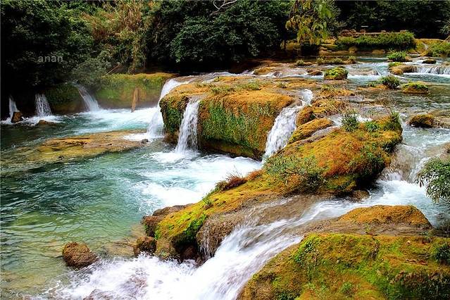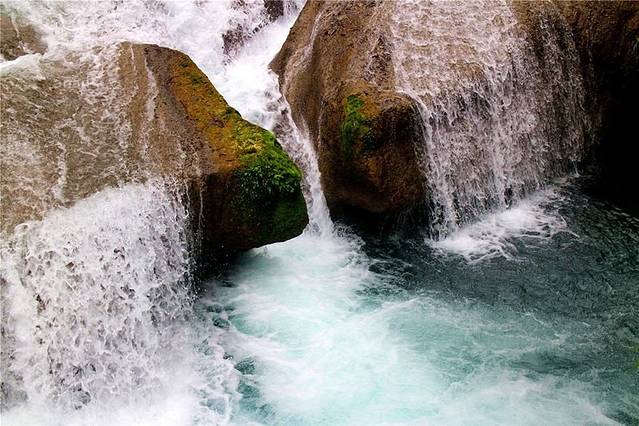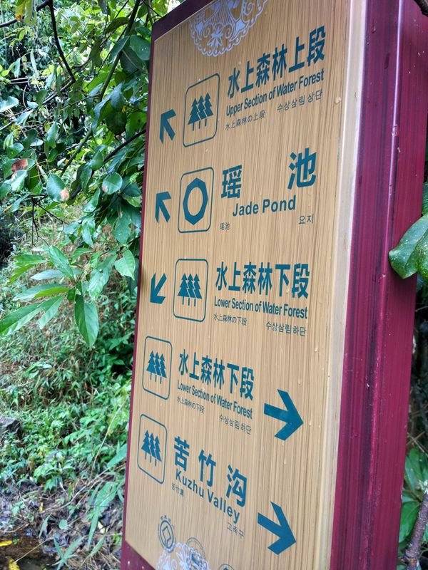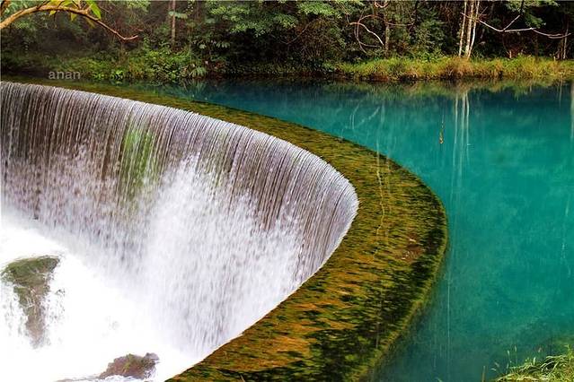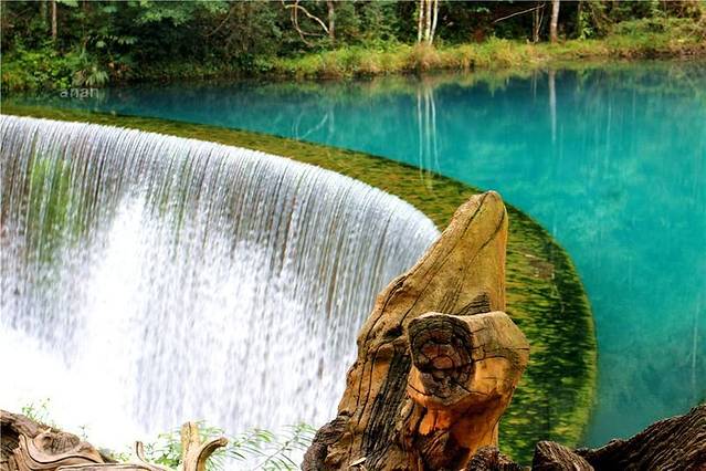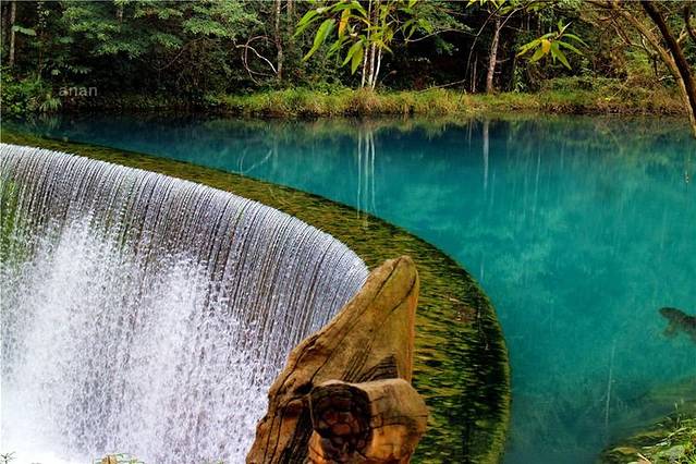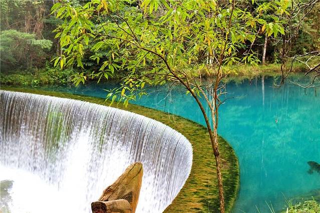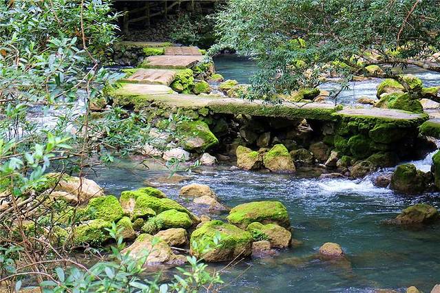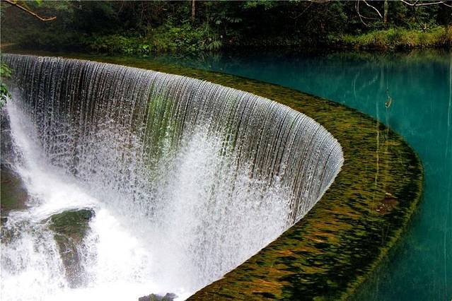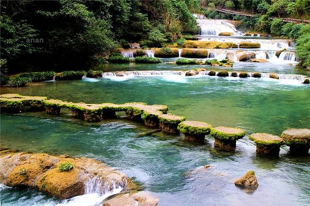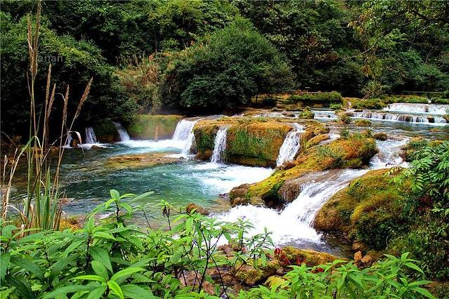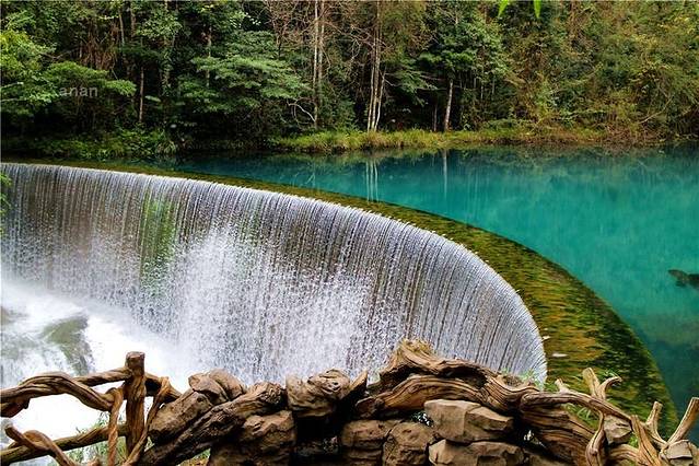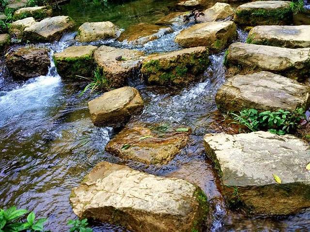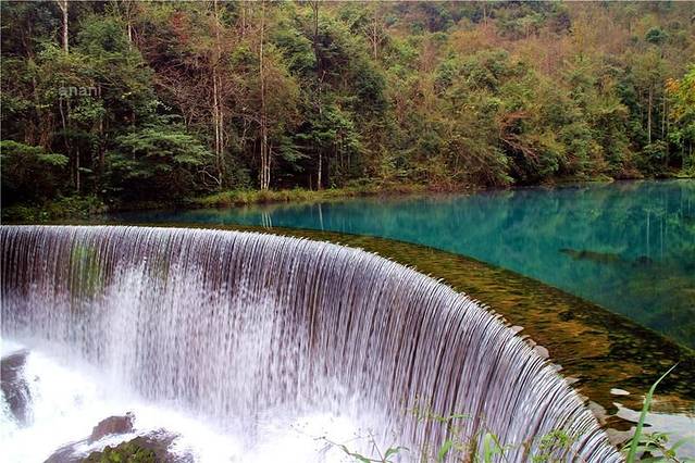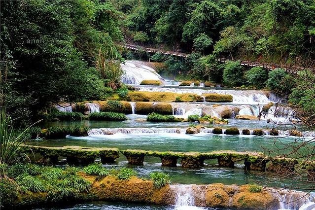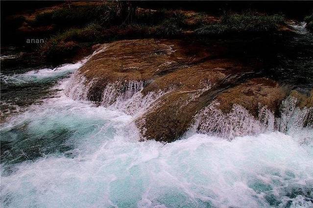 ② 水上森林:水上森林属世界级景点,全长600M,分上下两段,清澈的河水从河床的杂木林中穿涌而下。年复一年,日复一日的冲涮,河床已没有了一粒泥沙,连磐石也被激流磨光了棱角而变得“圆滑”起来,但树木却象多情的汉子,死死扎根在河床妻子的怀抱里,纹丝不动。