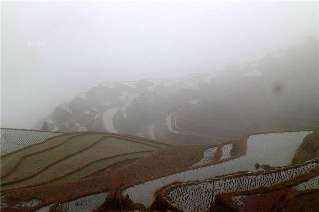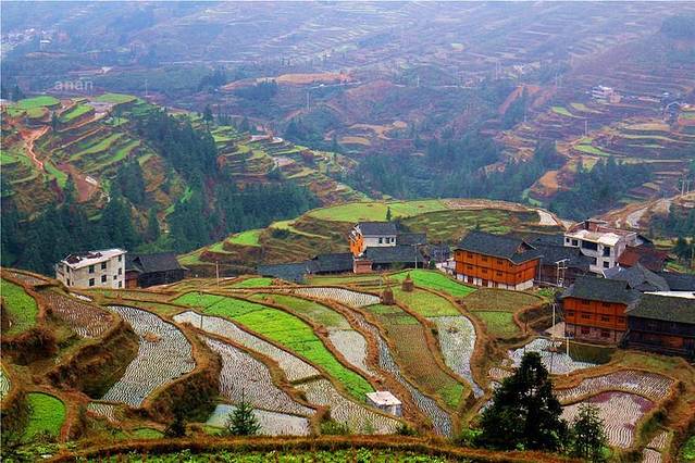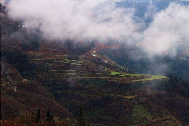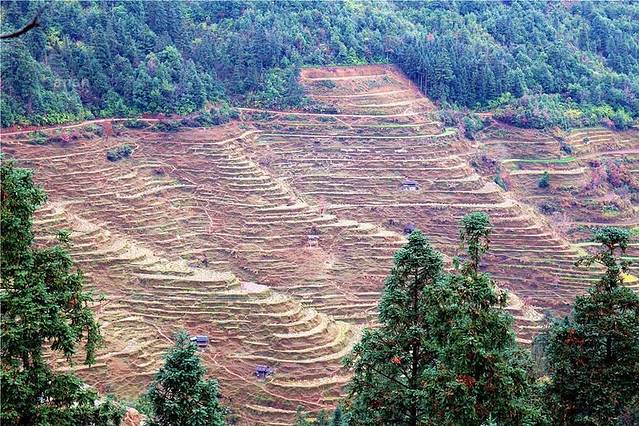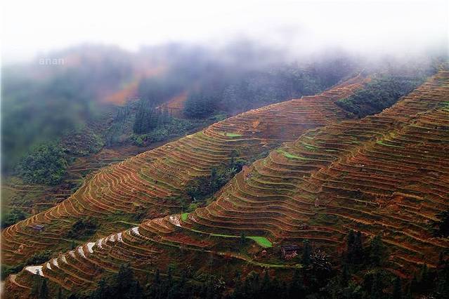 梯田间的山村、小寨与其交相辉映,和大自然融为一体,体现出人类与大自然的和谐之美。