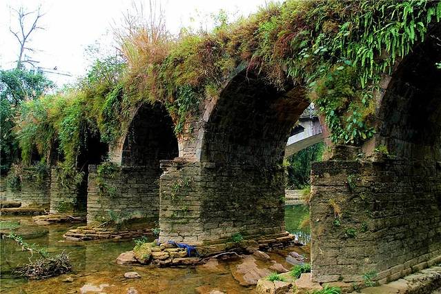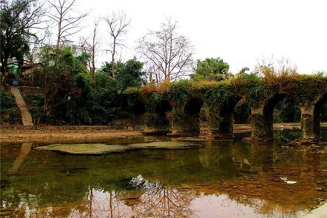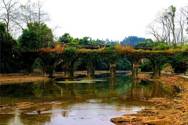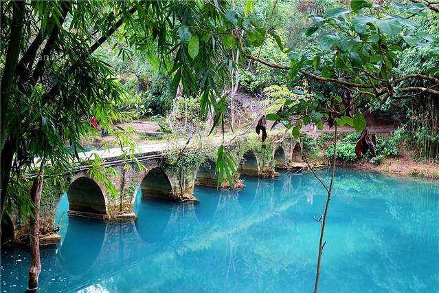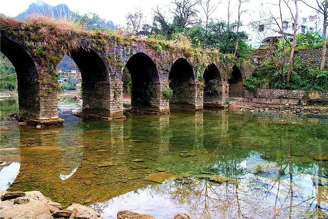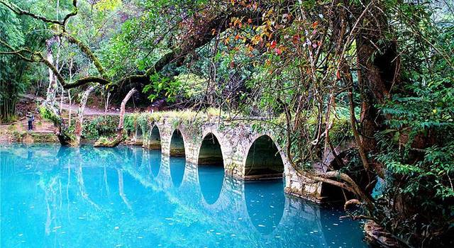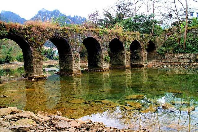 ① 小七孔桥:位于景区之首,景区之名由桥而得。这是一座小巧玲珑的七孔古石桥,桥长25米,桥面宽4米,拱高4米,建于清道光15(1836)年,昔为沟通荔波至广西的重要桥梁。此桥看似单簿,但几百年来它经过多次洪水冲击却泰然屹立,迄今完好无损,可见其建筑工艺的精妙。