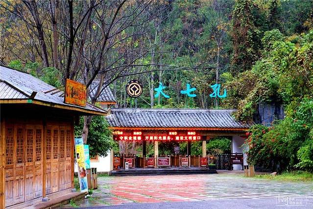 大七孔景区:位于荔波县南部,距县城25公里。大七孔景区是以原始森林、峡谷、伏流、地下湖为主体的景区,以进入景区的一座大七孔古桥而得名。沿着恐怖峡打狗河直下,可见吊桥,右边的栈道一面靠山,一边临水,蜿蜒曲折,凹凸不平,十分凶险。大七孔最为震撼的还是那高穹耸立的天生桥,走过栈道的三分之二处,有一横跨河两岸的天然巨岩,是喀斯特是貌奇观之一,俗称天生桥,被专家们誉为“大自然神力所塑的东方凯旋门”,仰观桥孔下,只见巨型钟乳悬挂,桥脚、桥侧的裂隙石缝长出绿石草丛灌木,藤萝花卉缠裹桥身,真是满目琳琅、五颜六色的天然大彩桥。
