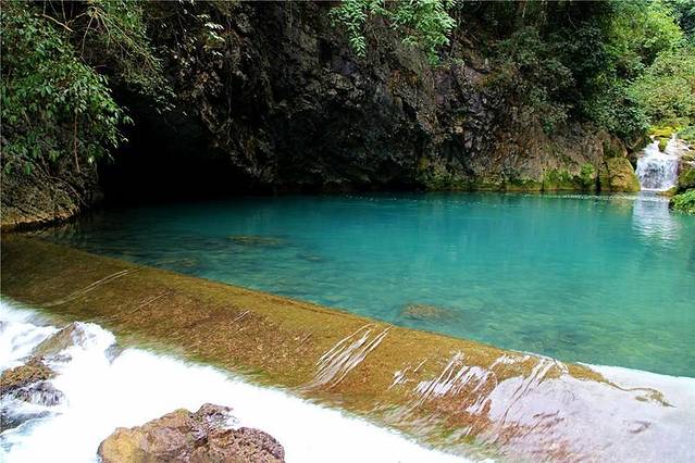 ④ 卧龙潭:卧龙潭位于小七孔景区内,潭面不大,从地表看它只是卧龙河的源头,近年又从这里筑坝引水发电后入响水河,成两河的总水源。水色在阴天的光线下由浅入深呈淡蓝、明蓝、暗蓝。潭边怪石奇树林立,古木森森,潭外水声轰鸣,雾雨蒙蒙,四周高山紧锁,水潭犹如地底深渊,即便是发洪水时,潭面也犹如镜子般平静。