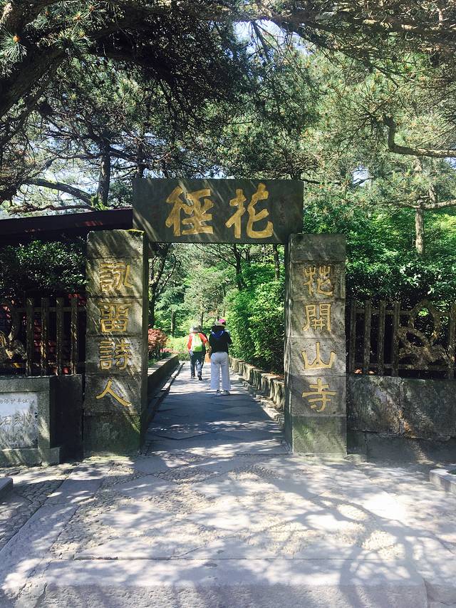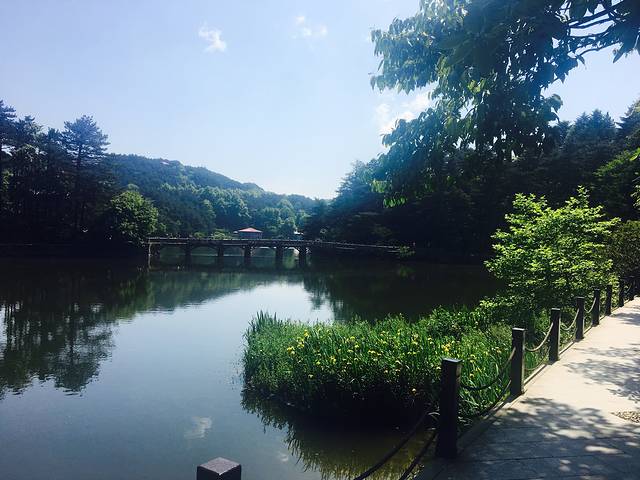 提前预定的牯岭大酒店,过了桥洞往南走就到达,位置很不错,酒店稍作休息,吃了点早餐后便出发了。酒店对面购买了观光车票80一张,虽然不便宜,但如果计划中有东线行程的话还是建议买观光车票的。9:30西线出发,第一站花径站,下车首先映入眼帘的是如琴湖,湖面形如小提琴,湖水与旁边的花径融为一体,景色怡人。进园后向右走可看到“白司马花径”还有据说是白居易提笔留下了的"花径"二字,向左边是九孔桥,此处凉爽且属于拍照极佳位置,远处观赏了一下便出发去锦绣谷。