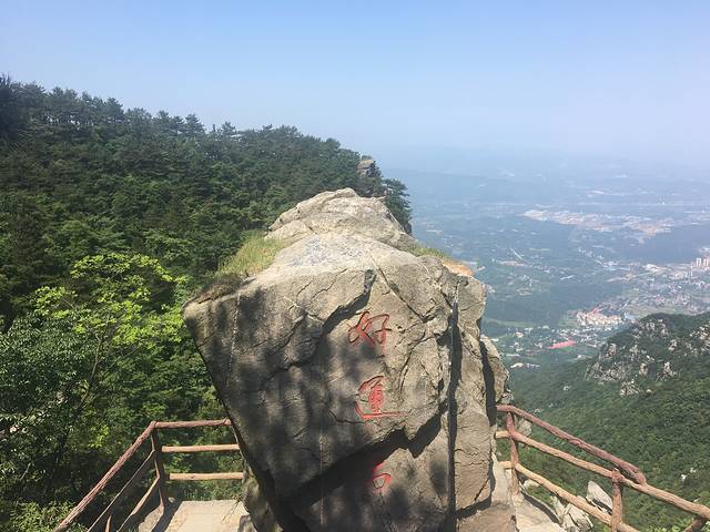 一路陡峭山壁, 一路俊俏松林,很快就到达了好运石,正好听到附近导游说男左女右,从左向右,一圈财运,两圈官运,三圈桃花运。看到标识牌上写有野生猕猴出没,一路寻找也没有看到,倒走到了险峰,很多人在此用金锁祈求祝福。