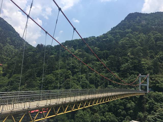 走了好多路,12点半到达了这个一心想看一眼的地方,似乎只能通过大天池西南侧循石阶到。此处是观云雾的好地方,景色极其奇特壮观,所谓“天池之石斗奇骨,拔地参天皆怒立”。更让我喜欢的地方应该是悬索桥,横跨于将军河面,站在桥上清心静目,从桥面走过感到微微的摇晃。悬索桥的尽头有两种方式可以到达电站大坝(体力还好的可以步行前往,稍微感到劳累的可缆车)。我们几人商议了一下,后面的路程也很长,于是决定坐30一人的缆车,不到10分钟的时间到达大坝。