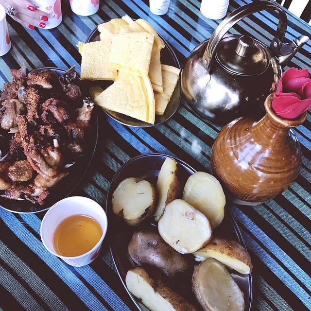 摩梭族的下午茶真的可以当正餐来吃了,我们才4个人,但是他不是按人头来的,就是按桌来的,晚餐10几个菜,司机师傅还会来跟我们说饭不够了跟他们说,再加,慢慢吃,那个酒很好喝的,你们可以尝下味道。