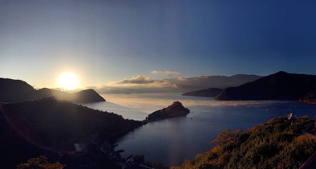 看日出,因为我们是想划船到泸沽湖中间看日出,但是司机带我们去的那个店8点才营业,我们就让司机师傅带我们去山上看了,可还是迟了一点。