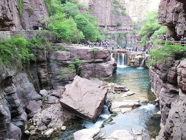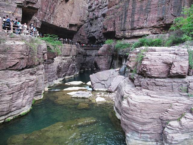 进入云台山风景区大门乘坐景区观光车,第一个游览点就是红石峡景区,也是云台山景点的精华。下了观光车在公路上已经能看到深深的崖底下一潭碧水和如蚁的人流。
