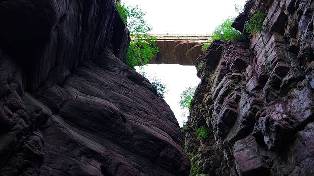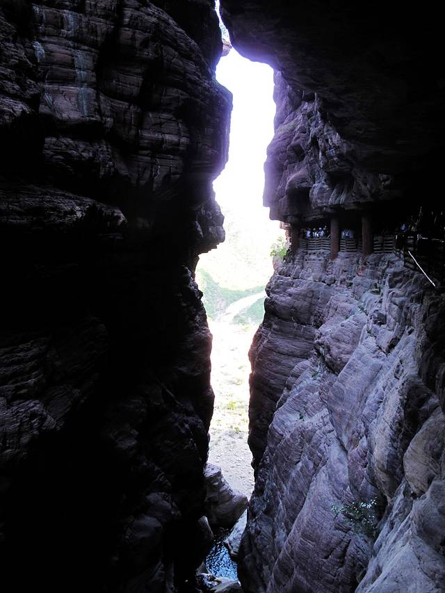 回身一望两边高峻的崖壁形成一条狭窄的峡谷 “一线天”。涧水分开山体,绝壁高耸,崔巍对峙,山体相合只留一线天地,仰头望去是那不宽的光亮。