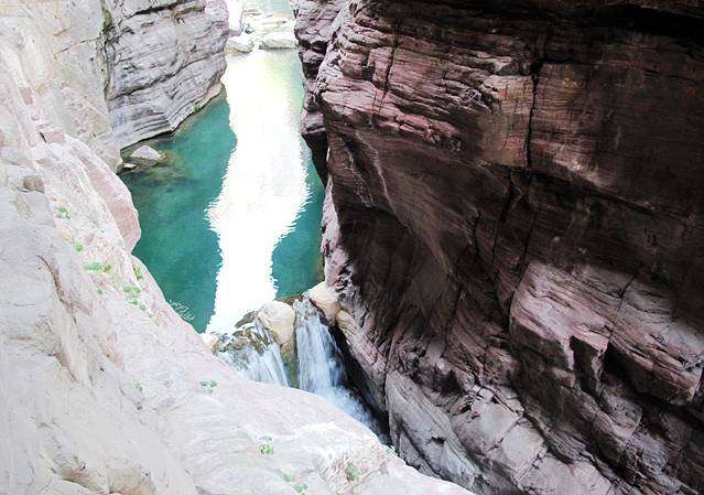 随着蠕动的人流下到谷底,未见有水先闻有声,感觉凉快许多。转过一个弯一汪深潭进入眼中,谷底的流水落差并不大,竟能造成如此大的水声,想来是窄而高的峡谷有扩音的效果。
