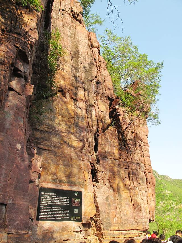 这一片色彩鲜艳纹理清晰的红色岩石是12亿年前的滨海沙滩形成的,伴随着当时的潮涨潮落,云台山一带时而沉入海底时而露出海面,岩石中保留着交错层理及波痕、泥裂等丰富的沉积构造遗迹,就是当时古海洋存在的证据。眼前的地质奇观让你领略什么叫做真正的“沧海桑田”。