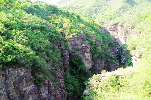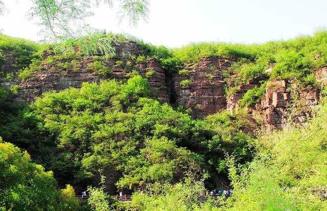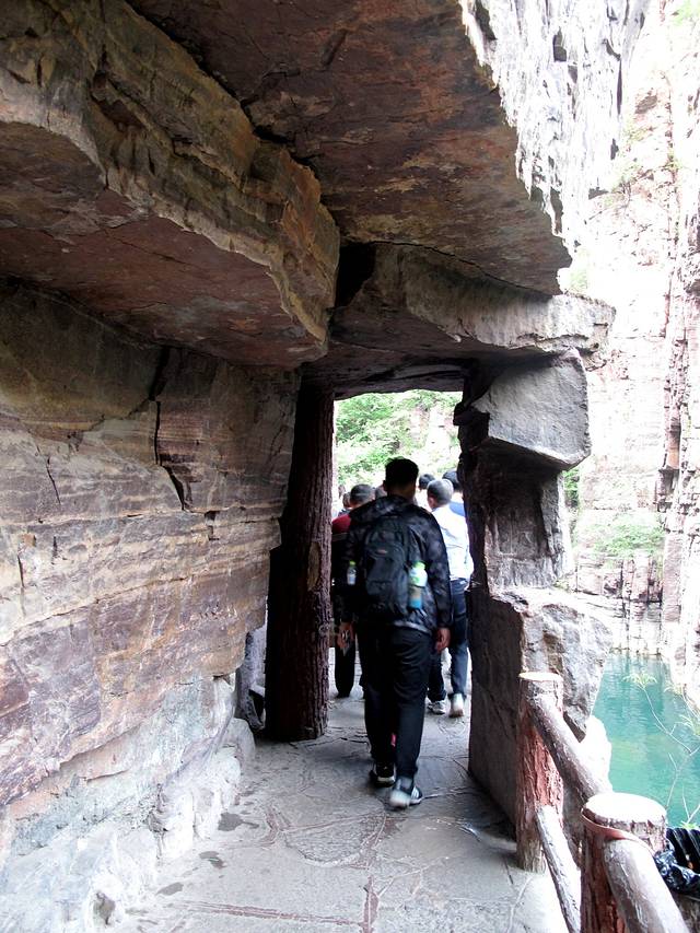 这里应是红石峡景区的精华段了,集秀、幽、雄、险、于一处。这里的水绿绿的,清澈见底,这里的石头,是红色的,两岸崖壁山石秀丽,抬头仰望,可以看到两边峭壁林立,犬牙交错。明代怀庆知府徐以贞曾写诗夸道:“何年鬼斧劈层崖,鸟翼飞来一线开。斜阳在山归意懒,不堪回首重徘徊。”越往里走越美不胜收。