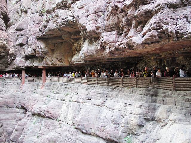 被誉为“华夏第一奇峡”的红石峡,长1500米,最宽处不过20米,最窄处不到5米,整条峡谷处于地表以下。游览这个景点,都要沿着一条弯曲的阶梯路,一步一步地下到86米深的谷底,才能欣赏到深藏的奇景。沿着陡峭的石梯下山谷,山石层层叠叠,贴着山崖前行,人嵌在崖壁中且看且行,反正是单行线不怕迷路。 小道弯弯曲曲,最窄处只容一人通过。若是不小心,个子高的人难免不会被山石碰头。