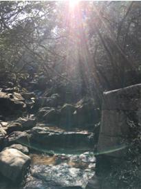 顺着人流一直走到谷底,经过小山涧,阳光透过树叶洒下来,能看到斑斓的光晕。