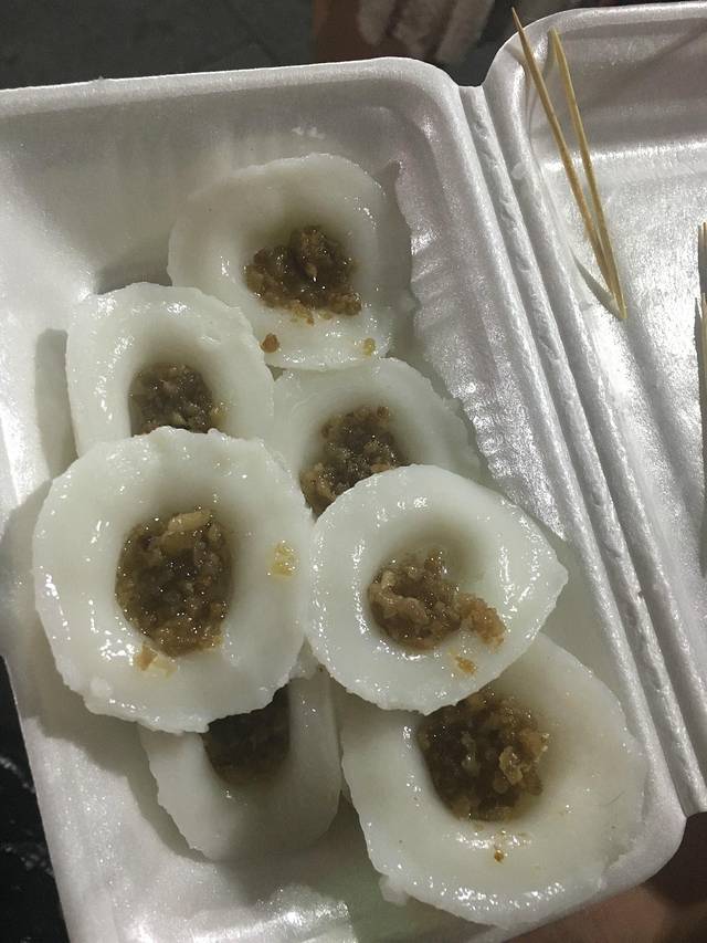 在牌坊街看见一位老爷爷卖这个,十分好运的买到了倒数第二份,白色的像糯米做的没有味道,只有中间的馅料的咸菜味,感觉可以试试,个人并不是特别喜欢。