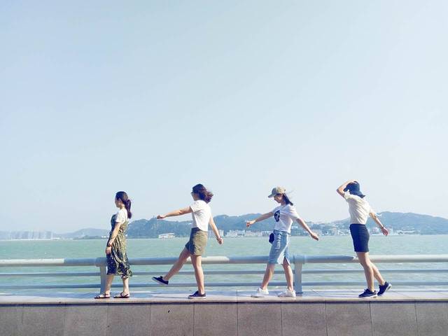 在海边就是不一样,风有点大,空气中带点湿润,在蓝天碧水中,我们终于有了拍照的感觉。