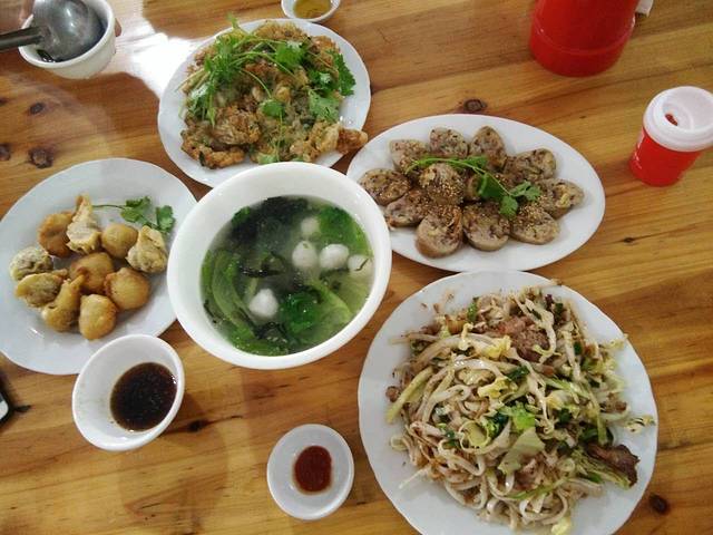 从左到右:果条/鱼丸汤/蚝烙/糯米血猪肠/炒粿条