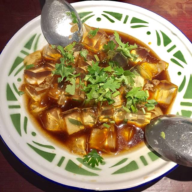 这个凉粉吃着像果冻,下边放的老陈醋特别多,用勺子挖一块凉粉,带点汤汁,酸酸的,特别开胃👍👍👍