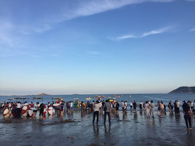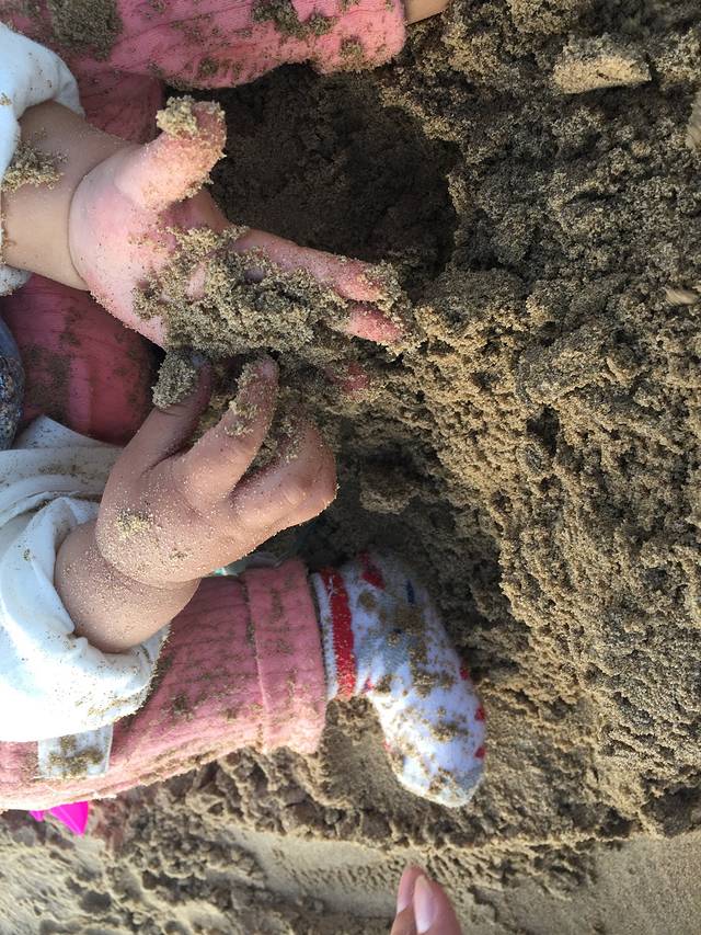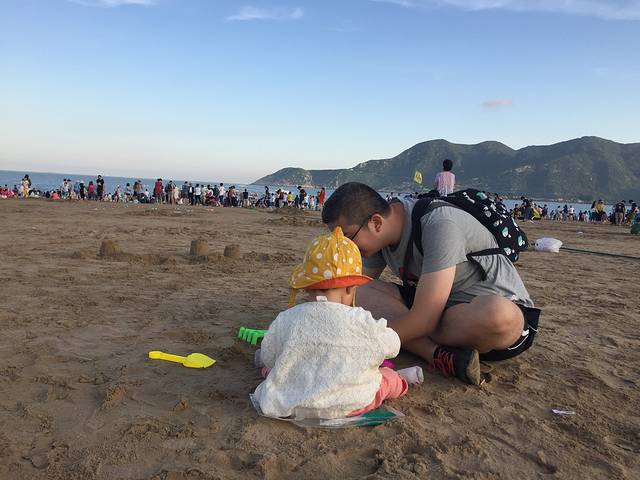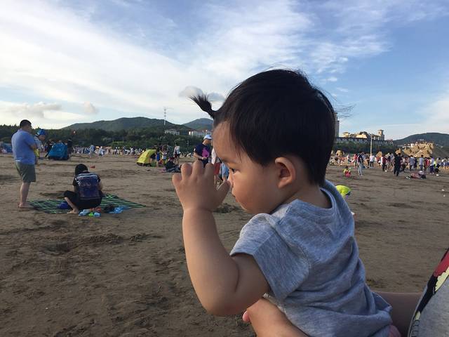 云彩特别白天特别蓝,我们去沙雕广场要跨海,舟山本来不是很大,但🚖到朱家尖沙雕广场也不近,沙雕广场白天票价70一人,但是五点后免费开放,我们就等到五点才进去,好多人在外面等,进去除了看看沙雕就是看看海,在沙滩玩玩,我们主要是想带安如玩沙子。第一次到🏖️,第一次玩沙子,由一开始的不敢动,到放到嘴里尝尝沙子的味道,最后直接放心大胆的抓玩起来,虽然最后弄的满身是沙子,尿不湿里面都是,但是看见安如这么开心,我们觉得一切都是值得的。来沙滩玩一定要带拖鞋啊,而且也不用担心弄身上沙子,这里很人性化的服务,沙滩旁都有冲洗区。看见很多小朋友肆意玩沙戏水,真是期待安如长大那一天,带她看海戏沙