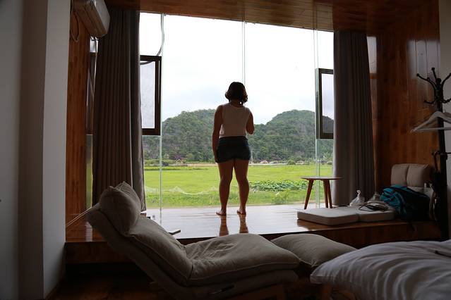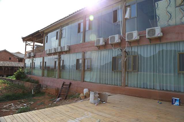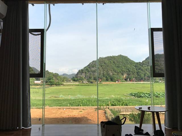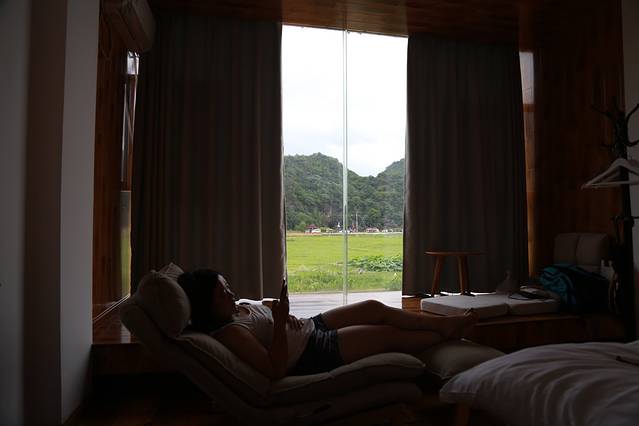 我选了有榻榻米的软床房间,还多要了一个躺椅,错开高峰期来真是好。民宿在青龙山对面,房间的全景落地玻璃窗可以看到一片绿绿的田野,符合我寻找诗和远方旅行目的。躺在房间里用遥控器控制着窗帘的开合,躺在床上看日落看清晨真是一种享受,如果能看星星就更好了,不过因为这里旅游开发,晚上外面灯光还是有的一些,也可能是云比较多,没有看到很多星星!