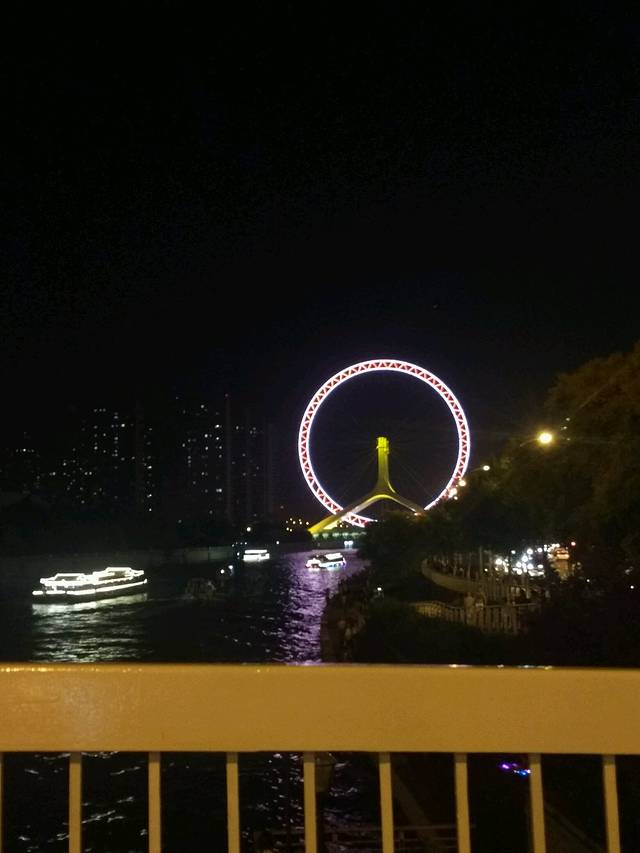 吃饱喝足,我们骑行回酒店。晚上温度适宜,非常舒服,途径金刚桥,意外发现绚丽的摩天轮与贯穿两座大桥的海河融为一体,永乐桥天津之眼尽收眼底,远景非常不错。