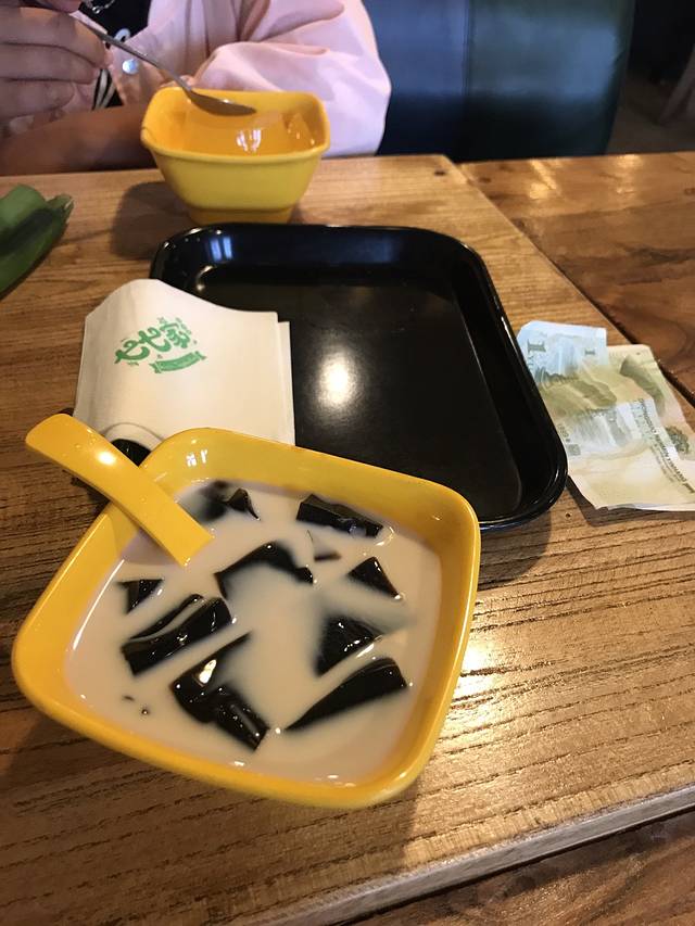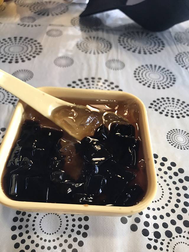 当地人取的黑凉粉,其实和仙草冻一个味道。配的稀释了的红糖水,爽口。
