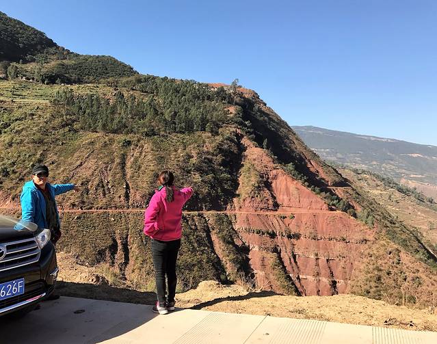 第2天早晨,在客栈吃早点时,不甘心走回头路(GPS让从头天的来路回到发窝乡再往东穿插到东川)的我向客栈老板打听有什么近路到东川,老板在县城教育局工作的大舅子正好回来玩,他向我们推荐走对面的汤朗乡,为了落实己衣镇到汤朗乡的路是否已经能通车,还专门给他在两地交汇处的亲家打电话咨询,说“从己衣镇下坡走一段土路后就有水泥路到汤朗乡,然后就是柏油路到东川......“