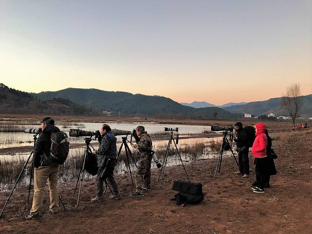 太阳快出来时,沼泽中的黑颈鹤睡醒了,一拨又一拨地起飞,说是要飞到周围的山林中玩到天黑以后才回来。看大家都在抢拍,我也拿手机跟着拍了几张,来也来了,好歹也冒充一次“鸟人”