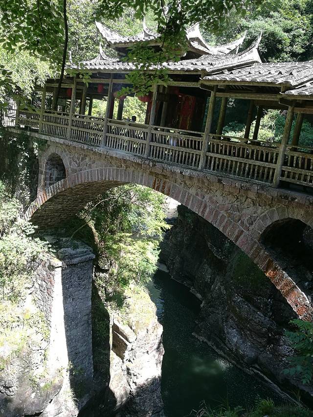 这座五孔石拱廊桥建在两岸陡峭的石壁上,看似不长,实际桥面离谷底水面很高,在山区这样的条件建成这样的石拱桥实在很不简单!